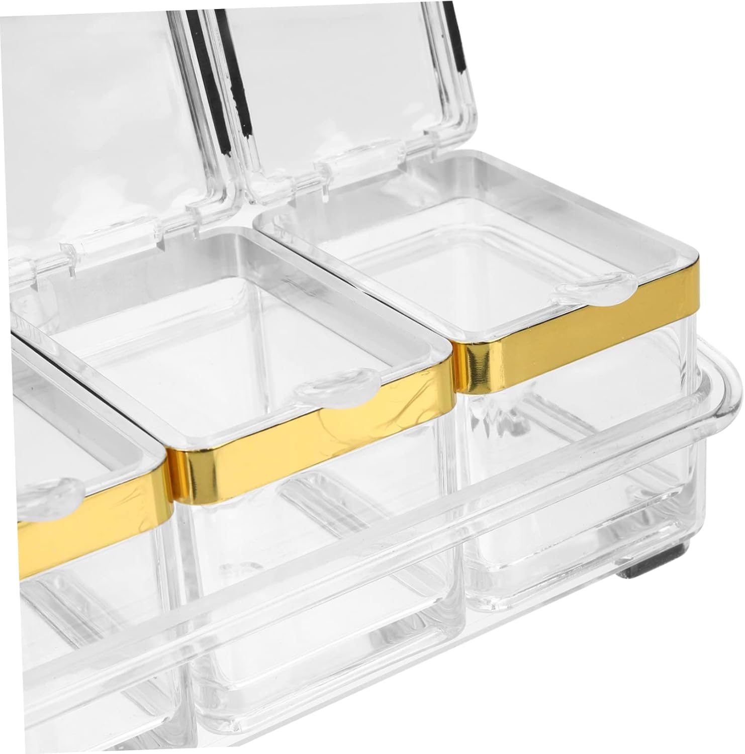 Package Include 4 x seasoning jars 4 x spoons 1 Characteristics -Size:34.00X8.50X8.00cm/13.36X3.34X3.14in condiment storage pot -Material:Acrylic, stainless steel condiment storage container -Color:Golden kitchen spice jar - Multi-purpose: great spice storage box for home, hotels, cafes, buffets, parties, and etc small seasoning containers. - Compartment condiment dispenser, non-slip seals on all of the tray and around all lids mini seasoning container. - Great for storing and preserving a variety of ingredients including salt, sugar, pepper, star anise, cumin preserves, jams, chutneys, flours, tea, coffee, , spices and more seasoning storage jar. - Made of high grade acrylic with a stainless steel ring around each pan for durability and easy cleaning kitchen seasoning holder. - Great for home kitchen, restaurant kitchen, camping, travel and more condiment container.Goods Descriptionkitchen sealed jar Fine workmanship, practicality.salt and seasoning container This spice box is made of ,which can withstand use.kitchen spice jar Features the stainless steel and acrylic material,which has high durability, not easy to deform.seasoning storage case This spice box will make seasoning storage easier and smoother