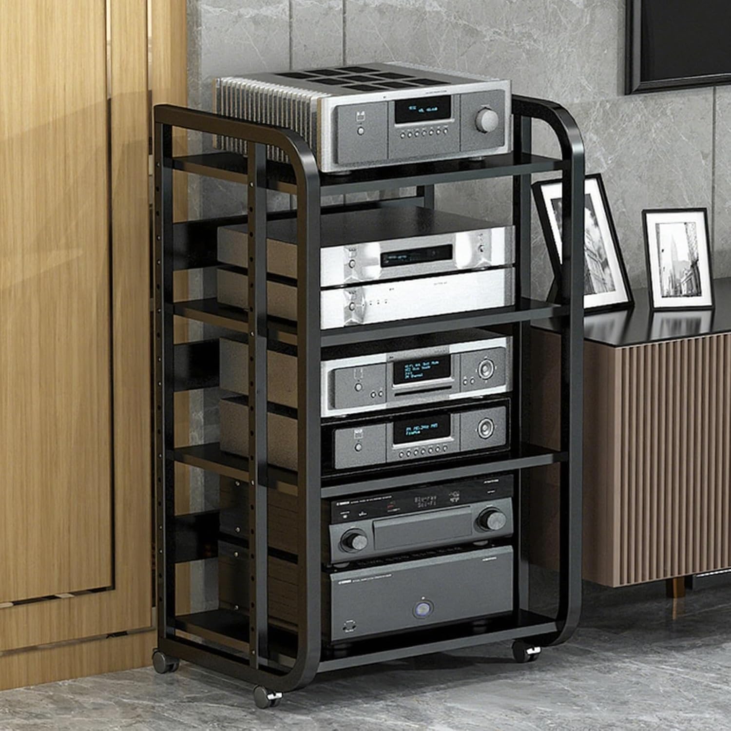 This media Stand is designed to conveniently organize audio and video equipment around your TV. It's perfect for stereos, center channel speakers, game consoles, DVD players, and streaming devices. 》》Eco-Friendly Panels: This audio cabinet is constructed from eco-friendly panels that offer strong load-bearing properties. The anti-wear coating on the surface is odor-free and protects your home's healthe.》》Easy to Clean: The smooth, water-resistant surface of the panels allows for daily dust and water stains to be wiped away with a soft cloth.》》Spinner Wheels: The base features removable spinner wheels for quick and easy movement. They offer easy mobility and enhanced flexibility.》》Vertical Storage: A vertically layered structure organizes storage areas and arranges audio-visual equipment vertically, preventing horizontal stacking and excessive floor space.Specifications:- Tabletop Material: Wood- Frame Material: Steel- Style: Open- Furniture Structure: Frame- Assembly Required: YesPackage Included:1 x stereo cabinetInstallation Accessories