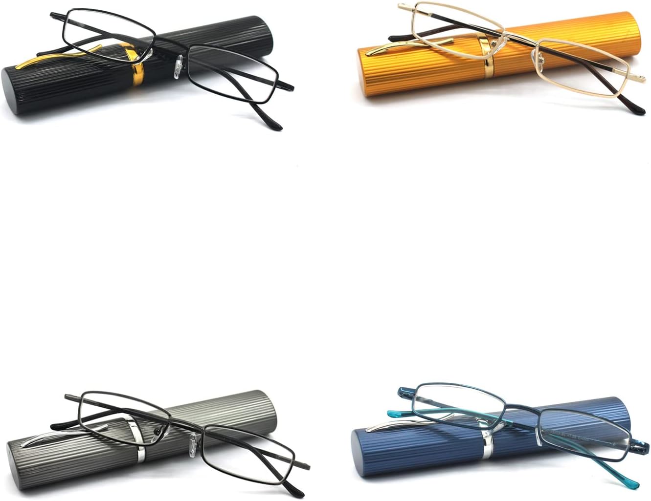EYE ZOOM 4 Pack Unisex Ultra Slim Compact Lightweight Reading Glasses with Portable Clip Aluminum Tube Case. Great pen-readers design, super lightweight tube aluminum case and high-quality metal frame readers, easy to carry and use. Clear and scratch-free acrylic lenses give you a better visual experience. Whether you are looking for reading glasses for office or home. EYEZOOM reading glasses will give you the premium protection. They are also perfect gifts to your parents and the elderly. Strength available: +1.0/ +1.25/ +1.5/ +1.75/ +2.0/ +2.25/ +2.5/ +2.75/ +3.0/ +3.5 Color available: Black / Gold / Gunmetal / Navy Blue / Wine Red Product includes the 4 Pairs EYE ZOOM compact reading lasses & 4 Pairs aluminum tube case with pen holder. Care: Please do not use finger or rough cloth to wipe and clean the lens as it may either stain or scratch the lens and reduce the performance of the lens, please use the soft cleaning cloth to gently wipe away dust.