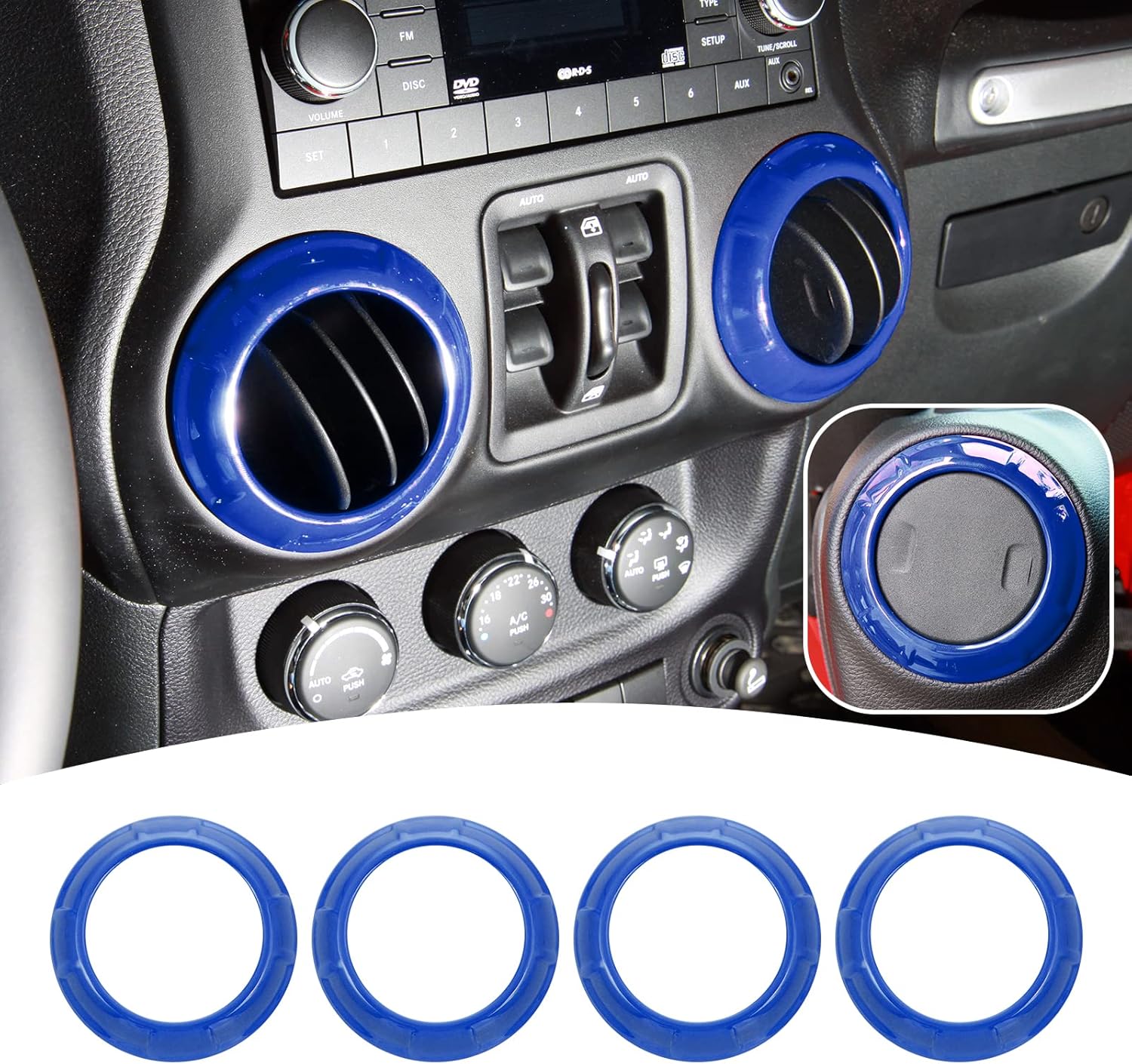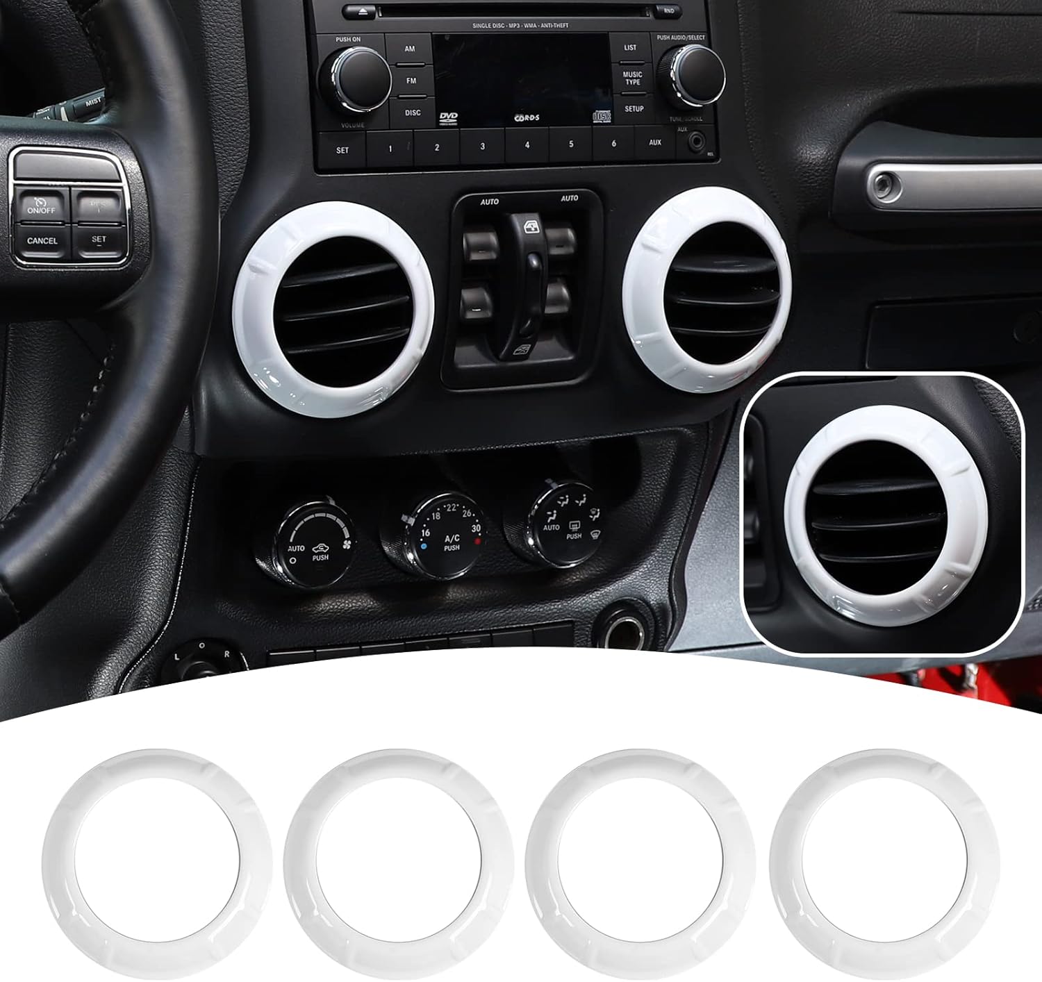 Description: JeCar center console dash air conditioner vent cover trim carbon fiber interior accessories compatible with Jeep Wrangler JK JKU 2011 2012 2013 2014 2015 2016 2017 2018 Rubicon Sahara Sport Unlimited 2-door 4-door. Features: - Provides a high-class and fashionable decoration style for your jk. - Made of high-quality, durable ABS material. - With a unique wood grain finish look, with a black dashboard, bring you a new visual experience - Original car data design, perfect match. - Come with double-sided tape for easy installation. Package Included: 4* Dash Air Vent Cover Trim Ring Installation Tips: Clean all positions where will be covered; keep dry without dust; Heat the adhesive tape with a hair dryer or lighter; Paste the accessories in the corresponding position and press them with your hand to make them more solid.