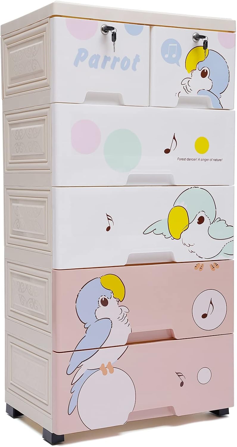 DescriptionThis 5-layer storage bin creates a dreamy storage space that combines practicality and aesthetics for you. Whether they are clothes, accessories, stationery, cosmetics, or children's toys, all kinds of items can find an exclusive place here, achieving efficient classification and storage and turning disorder into order. From then on, you will bid farewell to chaos, embrace neatness, and make life more comfortable. Now, take it home, and welcome this sweet gift for home storage!Key FeaturesBuilt to Last: PP material has good impact resistance, tensile strength and bending resistance, which is hard, durable, and not easily broken, guaranteeing a long service life.Flexible Movement: The bottom has four wheels. When it is necessary to rearrange according to different occasions, you only need to gently push the bins to complete its movement, saving time and effort.Fashionable Style: It adopts classic white color, adding a warm and romantic atmosphere to the living room and fully displaying a fashionable style.Strong Load-bearing Capacity: Whether it is storing large quantities of items for a long time or temporarily stacking heavy objects (Max. 55.1 lbs), its reasonable structure can provide reliable support and demonstrate excellent adaptability.Easy to Install: The product has a simple structure and complete installation components, and can be quickly assembled. It can be put into use soon.Storage Assistant: It has 5 drawers with large internal space and a strengthen top plate with an anti-slip groove for storage, helping you effectively solve the problem of disorder and achieve refined management of home life.Thoughtful Design: Each drawer adopts a full pull-out design with an anti-slip buckle, allowing a panoramic view of the contents inside. When opened, the drawer is difficult to drop out, greatly improving storage efficiency and ease of use.Satisfaction Guarantee: No matter what problem you encounter or have any questions, please contact us. We will reply and solve the problem for you as soon as possible. DetailsRound Edges: The edges of the bins adopt a round design, which is not sharp and greatly reduces the risk of accidental injury to others.Hand-pull Groove: It helps you easily and smoothly open and close drawers, and access your items at any time.ApplicationIt can be used in the bedroom, living room, study, dressing room, beauty shop, children's room, game room, hallway, etc., for neatly storing books, office supplies, snacks, clothes, and so on.SpecificationMaterial: PPColor: WhiteStyle: ModernShape: RectangularTreatment: Injection MoldingNumber of Layers: 5Number of Drawers: 5Max. Load-bearing Capacity: About 25kg/55.1lbsDrawer Inner Sizes: 39.5*25.5*13cm/15.6*10*5.1inProduct Size: 43.5*29*80cm/17.1*11.4*31.5inPackage Size: 31*39.5*45cm/12.2*15.6*17.7inNet Weight: 4.25kg/9.4lbsGross Weight: 5.05kg/11.1lbsPackage Included1* 5-drawer Storage Bin1 Pair* Keys4* Feet5* WheelsNotesPlease allow the slight color difference caused by the shooting light and 1-3cm error due to manual measurement, and make sure you do not mind before ordering.