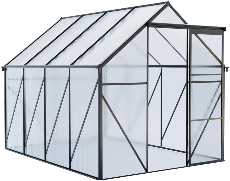 [Drainage System & Galvanized Base]The drainage gutter system can effectively drain water from the greenhouse to the outside. The sloped roof won't accumulate water on the top. alvanized base can be better fixed in the soil and protects the greenhouse from bad weather. [Sliding Door]The sliding door makes you easier to get in and out, also protects your plants or flowers from animals or pets getting inside. All detailed instruction are included already, so you can simply follow instruction to assemble. [Adjustable Roof]An adjustable roof is convenient for insects to come inside to collect pollen, helping to sow seeds and also providing fresh air at all time. A great ventilation system is built for your plants. [Heavy-duty & Durable Frame]The 4mm thick polycarbonate board can withstand outdoor temperature from -20℃ to 70 ℃, allowing enough sunlight to pass through and isolating most UV rays. The aluminum alloy frame with powder coating is more durable, won't get rust. The panels allow up to 70% light transmission for optimal plant growth while blocking out over 99.9% of harmful UV rays. [Walk-in Spacious Greenhouse]The ideal growing environment is large enough for you to plant numbers of plants, flexibly arrange your plants and flowers inside. Protecting your plants from frost and excessive heat, the green house creates a greenhouse effect to achieve and the best results of planting.