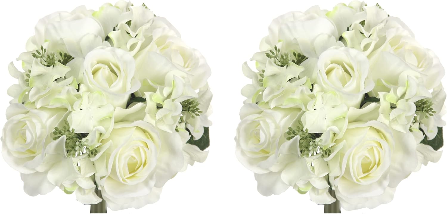 Beautiful stylish faux bouquet with arrangement of rose, rose Bud and Hydrangea mixed flower is one of most favorite wedding flower bouquet among bridal or bridesmaids' selection. The 9 stems artificial rose, rose Bud and Hydrangea mixed bouquet can be a good choice as it is neat, hassle free and look fresh all the time. This sweet and romantic rose bouquet will look great for home office decoration, spring summer decorations, wedding decorations, floral arrangements, or as a table top centerpiece arrangement with your favor vase. Size 12"H x 8.5"W x 6"D. Product may ship compressed. Dimensions based on image shown. Primping required to match the image shown.