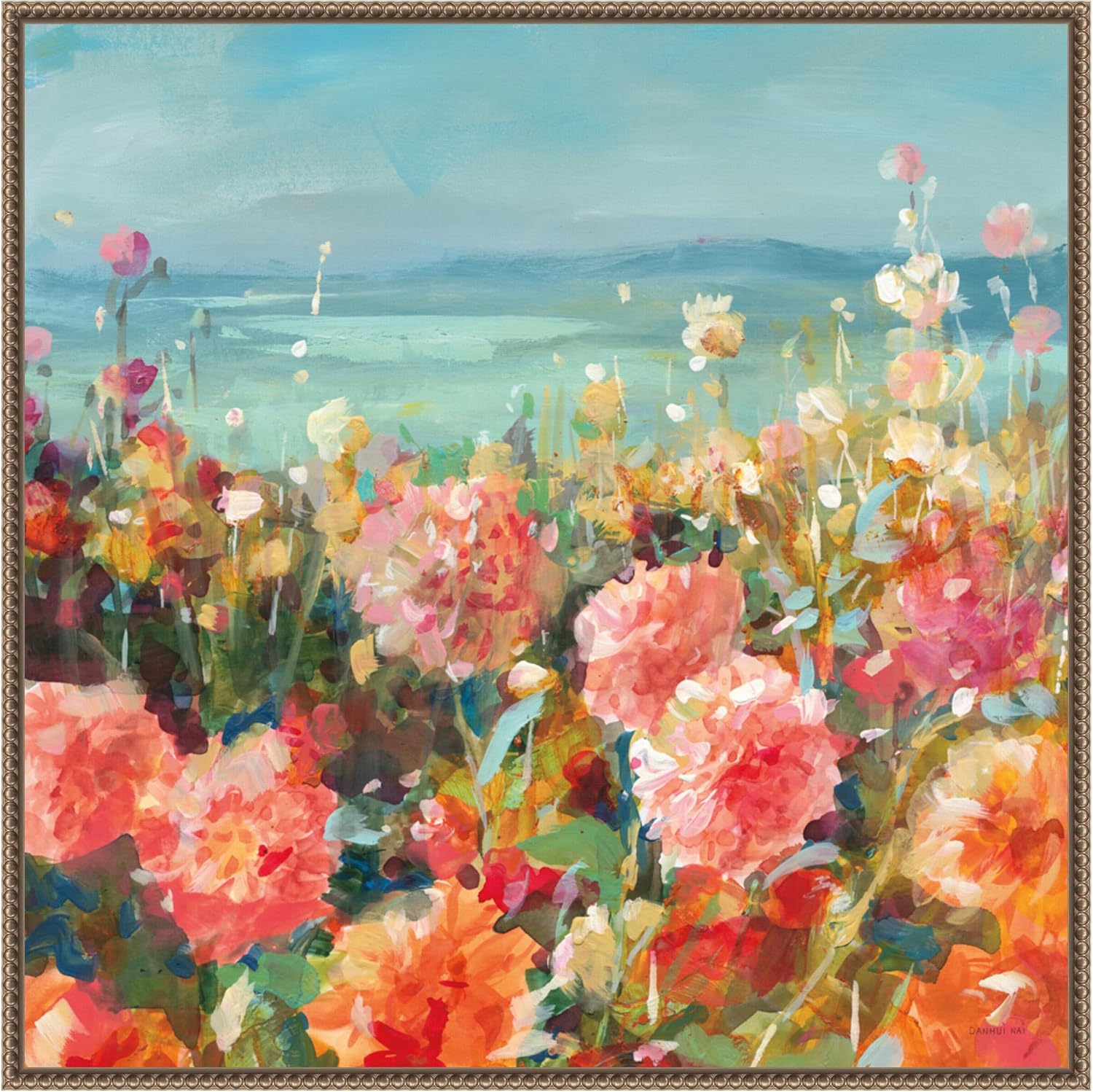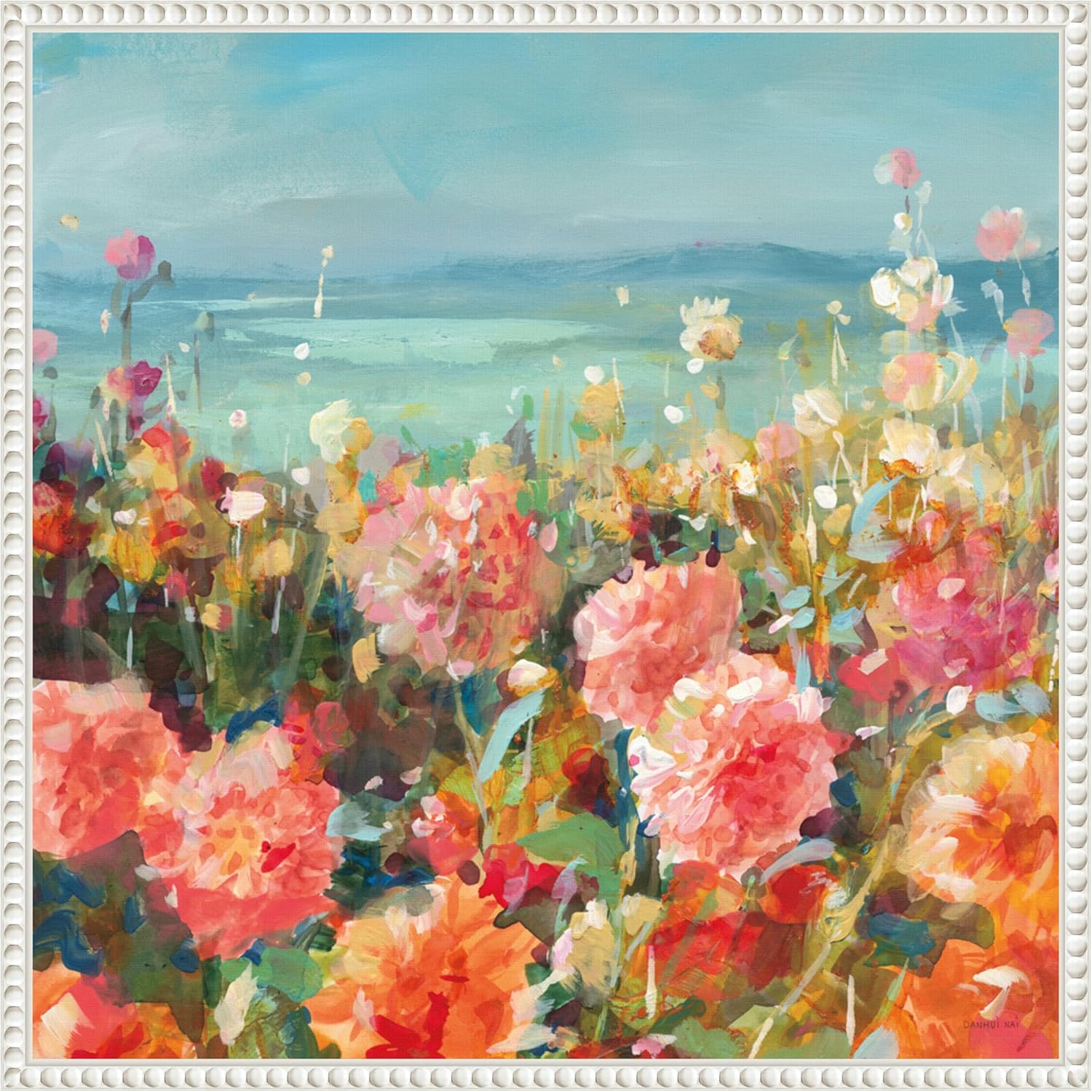 • CUSTOM CANVAS ARTWORK DETAILS: Coastal Dahlias by Danhui Nai. DESCRIPTION: The image depicts an abstract, impressionist-style painting of a vibrant and colorful garden. The painting is characterized by a variety of flowers in full bloom with an array of hues, including pinks, oranges, reds, and whites. The background suggests a serene, open landscape under a clear blue sky, enhancing the peaceful and inviting nature of the scene. The flowers appear to be swaying gently, creating a dynamic and li
