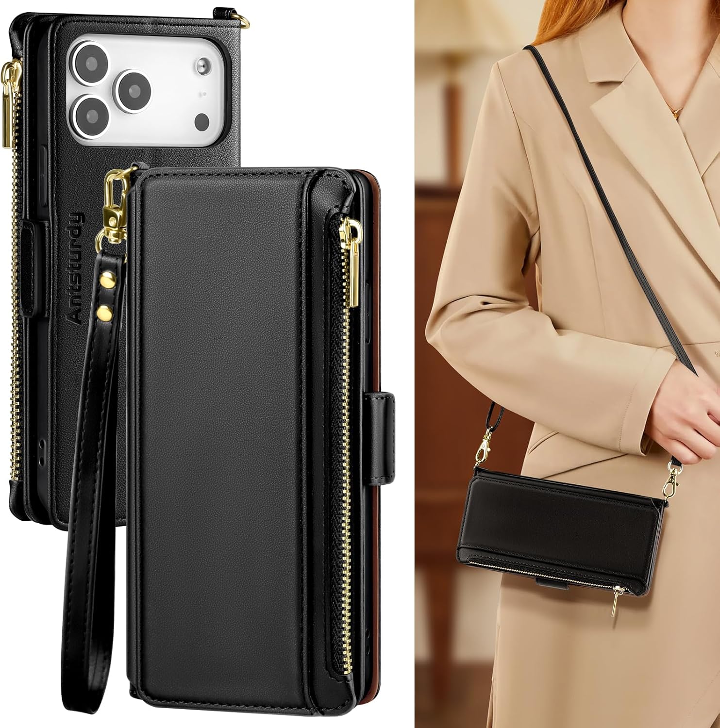 Antsturdy Compatible with iPhone 17 Pro Wallet Case Women,RFID Blocking PU Leather Phone Case Men Kickstand Flip Cover Wrist Strap Zipper Credit Card Holder Slots for Apple 17 Pro 6.3",Wine Red