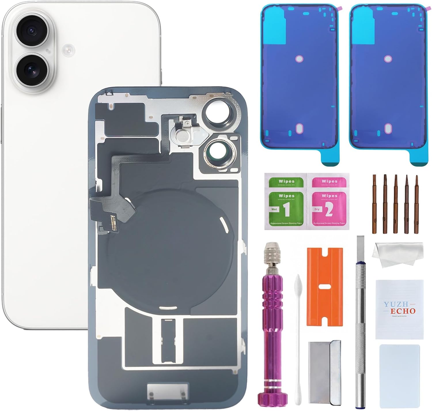 Product Overview: The 16 Plus(6.7 Inches)back glass features integrated cold-carved glass with a pre-installed metal camera ring and wireless charging module. This all-in-one assembly includes built-in components such as the wireless charger, flashlight, and microphone. Compared to standard large-aperture glass replacements, installation is significantly simpler – even beginners can replace it effortlessly.Applicable Repairs: Cracked back panel、Damaged lens glass、 Wireless charging failure. Included Repair Tools:Screwdriver*1Shovel blade*1WaterproofTape*2Disposable Cleaning Kits*2Disassembly card*2Single-edgeBlade*1Cleaning cloth*1Pry Pick*1Instruction Manual *1Cotton swab*1Lens protector*1Rubber band. For any product inquiries, contact our team for timely assistance and solutions.