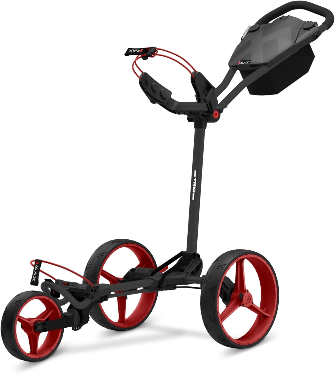 The BIG MAX Blade Trio is designed for golfers who prefer to walk the course without compromising convenience or performance. Built with a lightweight aluminum frame and an innovative flat-fold system, this push cart collapses quickly into an ultra-compact size for effortless transport and storage. Its stable three-wheel design glides smoothly across the course, while the ergonomic handle and dual foot brake provide confident control on any terrain. The integrated smart organizer panel keeps essentials like golf balls, tees, rangefinder, and phone neatly arranged and within reach. Durable, practical, and easy to use, the Blade Trio delivers everything you need for a comfortable and organized walking round — round after round.