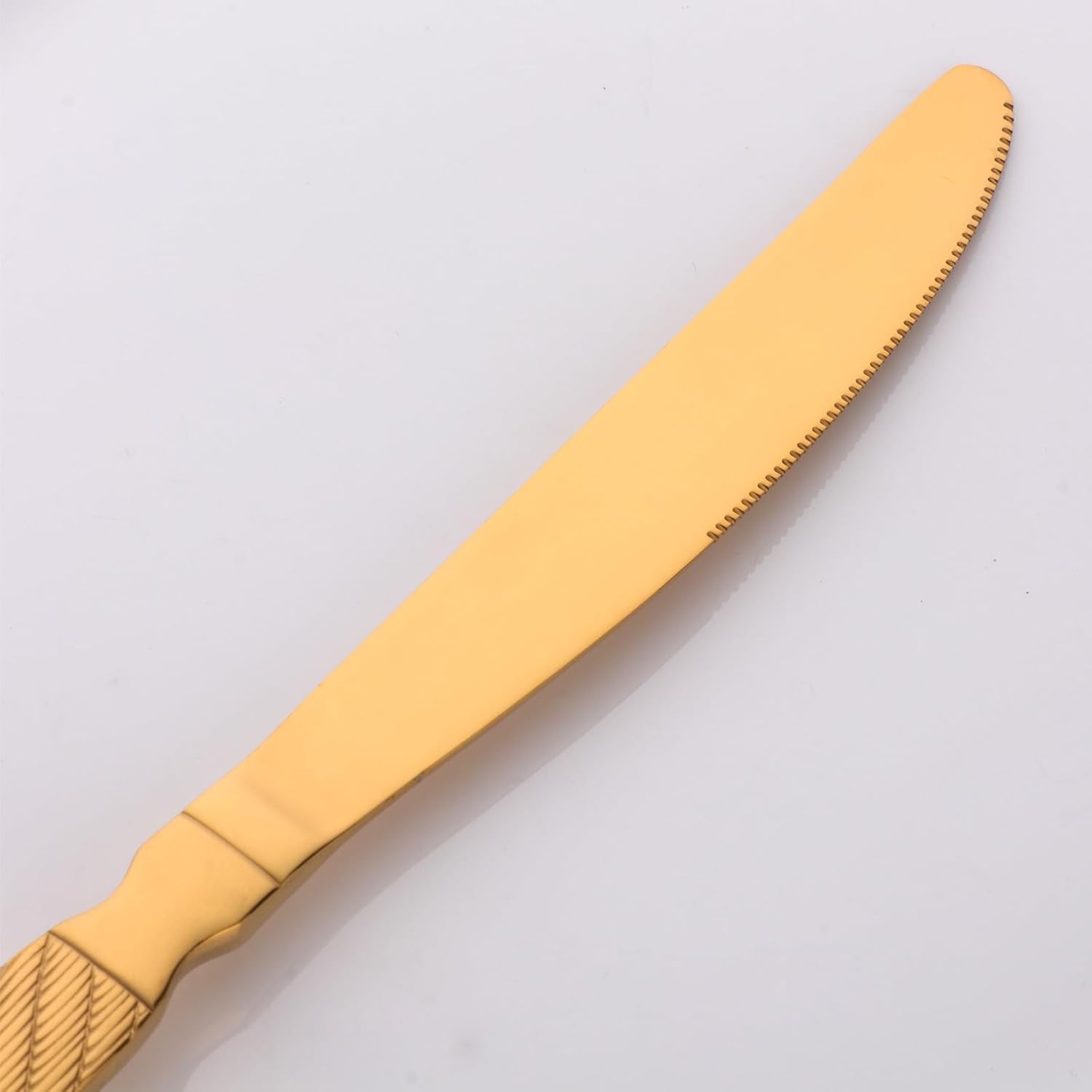 Size and Weight: Knife: 8.94 in, 0.1543 lb Fork: 8.15 in, 0.1279 lb Spoon: 8.15 in, 0.097 lb Teaspoon: 6.46 in, 0.0573 lb Teafork: 6.30 in, 0.0463 lb Introduction:Elevate your dining experience with Buyer Star 20 Piece Silverware Set, combining style and functionality. Made from high-quality, food-grade stainless steel, this set includes 6 knives, 6 forks, 6 spoons, and 6 teaspoons, designed for strength and longevity.The ergonomically designed handles feature a unique pattern for comfort and visual appeal. Each piece is perfectly weighted, enhancing your enjoyment of every meal.With a stunning mirror-polished finish and smooth edges, this silverware set adds elegance to your table while ensuring safety during use. Whether for formal dinners or casual meals, it brings sophistication to any setting.Cleanup is easy—hand-wash or place in the dishwasher for convenience. Enjoy relaxed moments with family and friends, knowing cleanup is a breeze.Available in various colors, this versatile cutlery set is perfect for any occasion, from home dining and restaurants to holidays, weddings, and picnics.