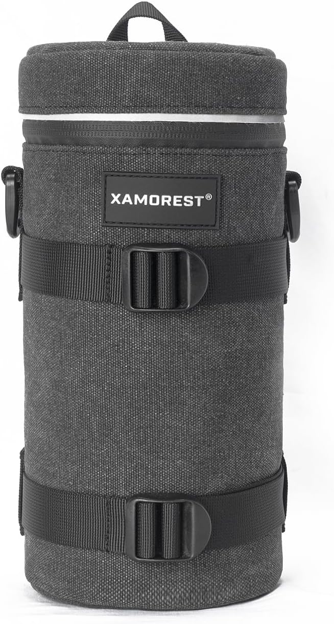 The XAMOREST waterproof zippered lens bag is compatible with lenses from various brands, including Nikon, Canon, Sony, and Leica. It's available in 1680D nylon and canvas. The zipper features a waterproof barrier, and the interior is fully padded to protect your valuable camera lens. It's been drop-tested by our manufacturer and proven effective. Sizes M and above come with a detachable shoulder strap for convenient shoulder carry while traveling. Alternatively, you can loop a waist belt through the loops on the back of the bag to attach it to your waist.