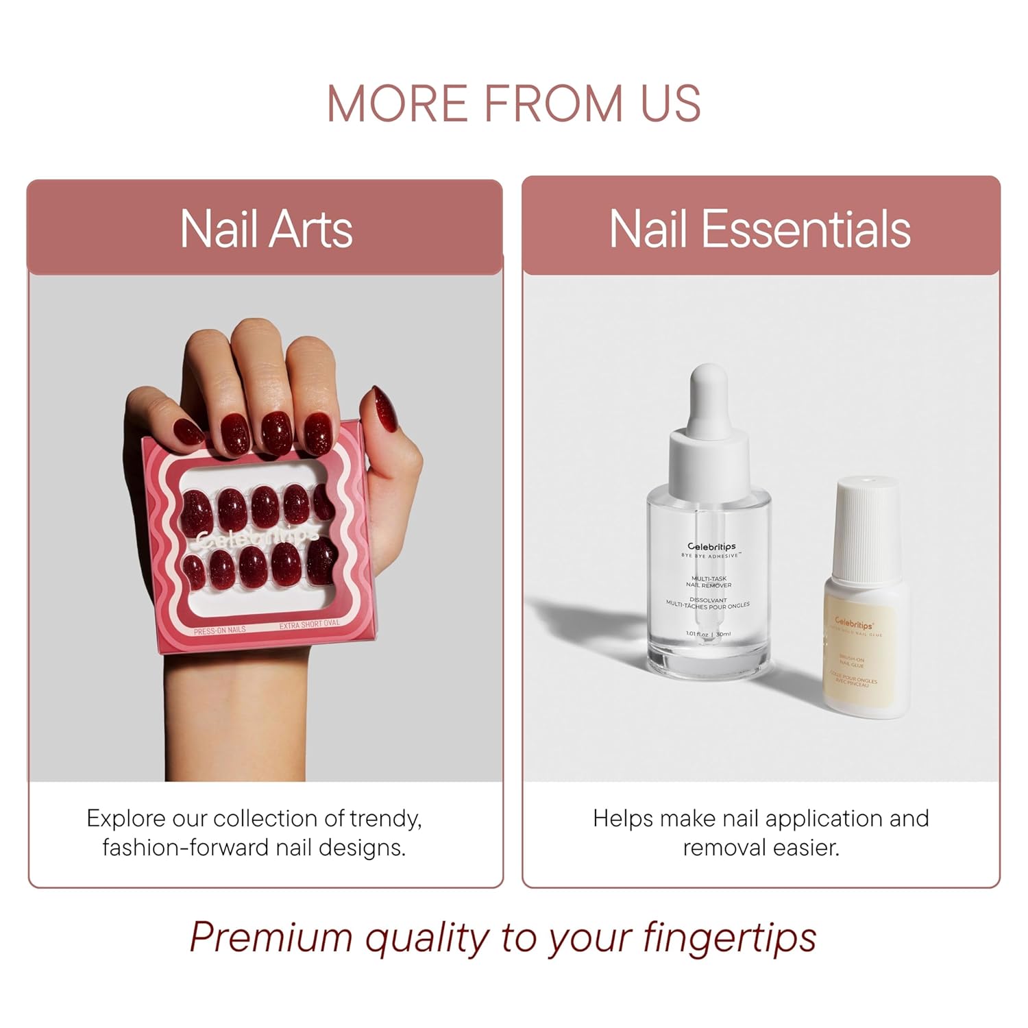 Celebritips Salon U-ltimate: Revolutionary Nail Perfection Our Salon U-ltimate line redefines press-on nails with its unique, salon-sculpted shapes and extreme durability. Wearing them feels like you’ve had a builder gel manicure done by a highly skilled nail technician. The U-edges—the ultra-thin surrounding ends of the nails that touch the natural cuticles—are specially designed to prevent lifting and hair snagging, ensuring a longer-lasting, flawless fit. Crafted from luxury-grade salon acrylic, these nails are reusable, non-damaging to natural nails, and exceptionally comfortable to wear. They can be applied using Celebritips’ Instant Nail Tabs, Super-Hold Nail Glue, or UV Gel Glue, allowing them to last anywhere from 3 to 30 days.