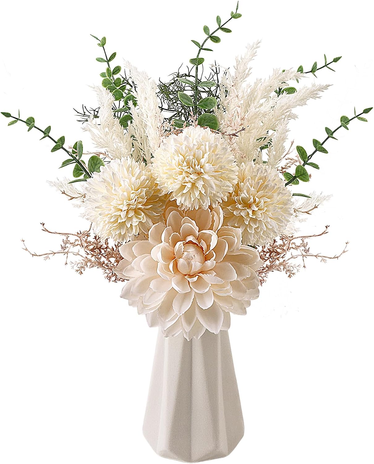| Included Components | rtificial floral centerpieces, including 1 bunch of fake bouquet with white and gray-blue flowers, some fake plants and a glass vase decorated with twine. |