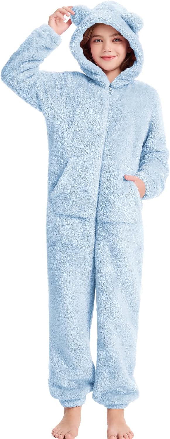 Features: Give your little one the coziest, cutest companion with this unisex kids hooded romper—where softness meets charm! Crafted from premium coral fleece, this kids jumpsuit wraps them in cloud-like plush comfort: warm enough for cold days, yet lightweight to avoid overheating, perfect for indoor lounging or outdoor adventures. Topped with a whimsical 3D bear hood, it doubles as an adorable bear costume that turns heads and sparks grins—stand out among girls outfits and boys onesies! Designed for busy mornings, it features a full-length zipper for quick on-and-off, elastic cuffs to lock out drafts, and a roomy kangaroo pocket for tiny hands or treasures. Versatile as a cute costume for Halloween/Christmas, school drop-offs, or lazy home days, it’s a wardrobe staple season after season. Available in sizes 5-14, this girls onesie and unisex favorite is the ultimate holiday/birthday gift—prepare for happy squeals when they unwrap its soft, charming design!