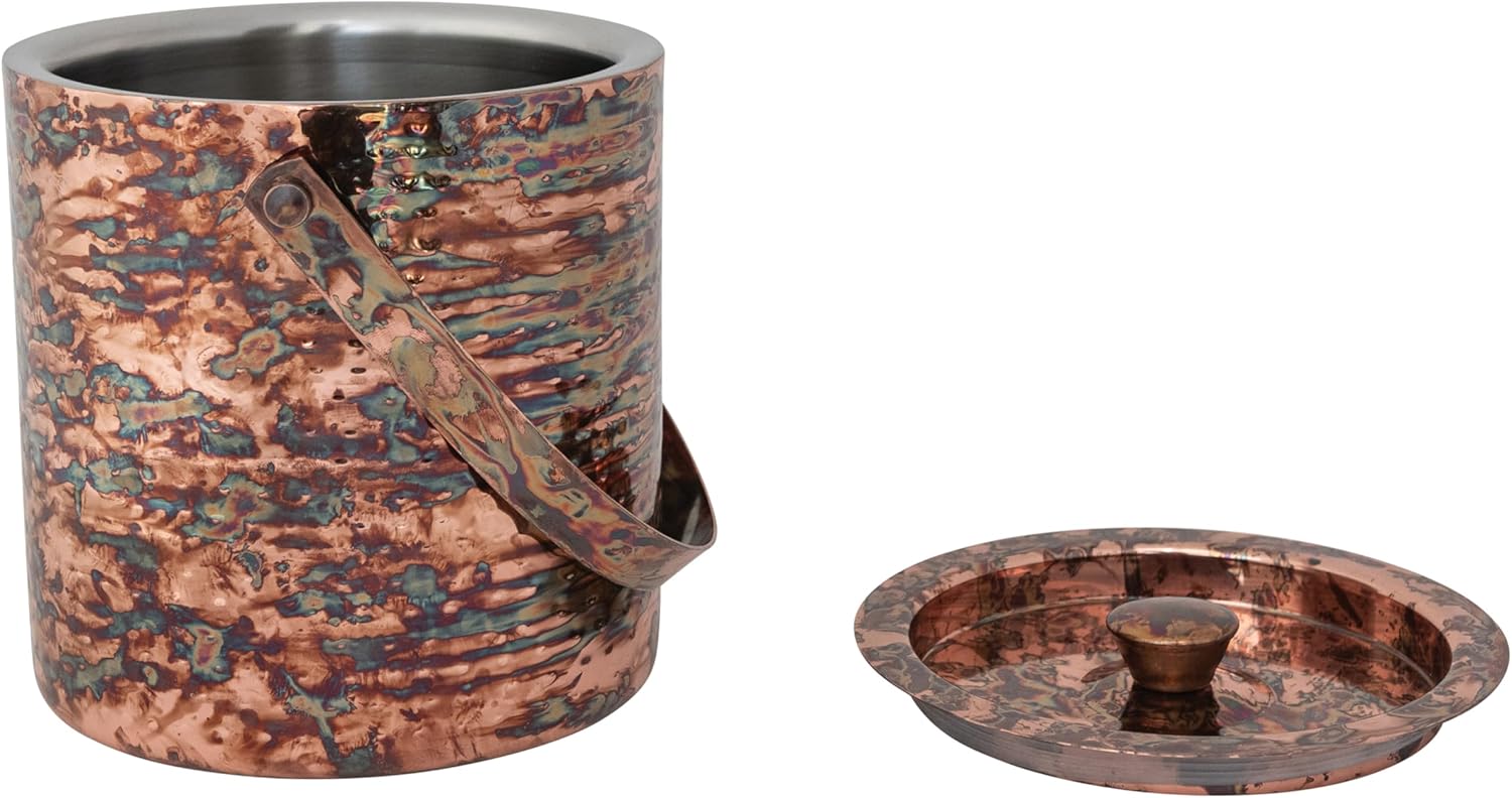 Add old-world elegance and practical sophistication to home bars or festive tablescapes with this 3-quart Hammered Stainless Steel Ice Bucket. Finished in a rich oxidized copper hue with a tactile hammered surface, it combines function and charm while keeping ice cold and accessible. The double-walled construction helps maintain temperature without condensation, making it ideal for effortless entertaining. Styled to suit Rustic, Vintage, or Lodge-inspired settings, it brings a sense of warmth and enduring character to any celebration. Measures 7 in diameter and 7 in height.