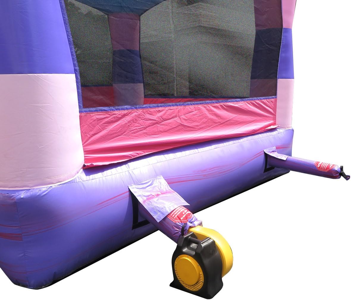 Create a magical and elegant play experience with the Crossover Deluxe Pink and Purple Castle Inflatable Bounce House. Designed to deliver a premium aesthetic paired with dependable commercial-grade construction, this refined castle theme is a standout choice for princess-themed birthday parties, school events, and rental businesses. It offers a polished, eye-catching presence while maintaining a footprint that fits comfortably in most residential backyards. The spacious enclosed jumping area provides children with plenty of room to bounce and play. To keep kids even more active and engaged, the interior features a built-in basketball hoop, perfect for encouraging friendly games and physical coordination. With a 500 lb total weight capacity, this unit comfortably accommodates up to four children at once, making it ideal for group play at busy gatherings and community events. Safety and longevity are engineered into every detail. The bounce surface and high-stress points are crafted from heavy-duty 15 oz vinyl, while secondary sections utilize 9 oz vinyl to ensure the unit remains manageable for a single person to move and set up. Triple-threaded, heat-welded seams protect against wear from debris, significantly extending the life of the inflatable. For added peace of mind, finger-safe netting provides maximum visibility, a wide ramp ensures easy entry, and the sun-protected roof offers vital shade during outdoor use. Designed for convenience, this jump house features zipper access for rapid deflation and easy interior maintenance. The package includes a compatible blower that inflates the unit in approximately two minutes, along with a storage bag for organized transport. Measuring 13 x 12 x 14.5 feet and backed by a 90-day manufacturer warranty, the Crossover Deluxe Pink and Purple Castle Bounce House delivers reliable performance and hours of imaginative, active fun for kids of all ages.