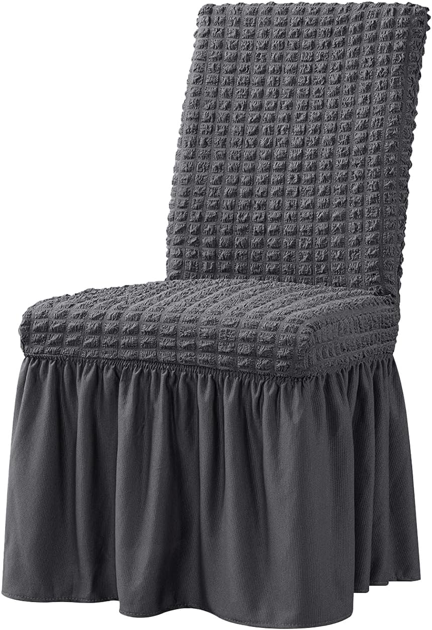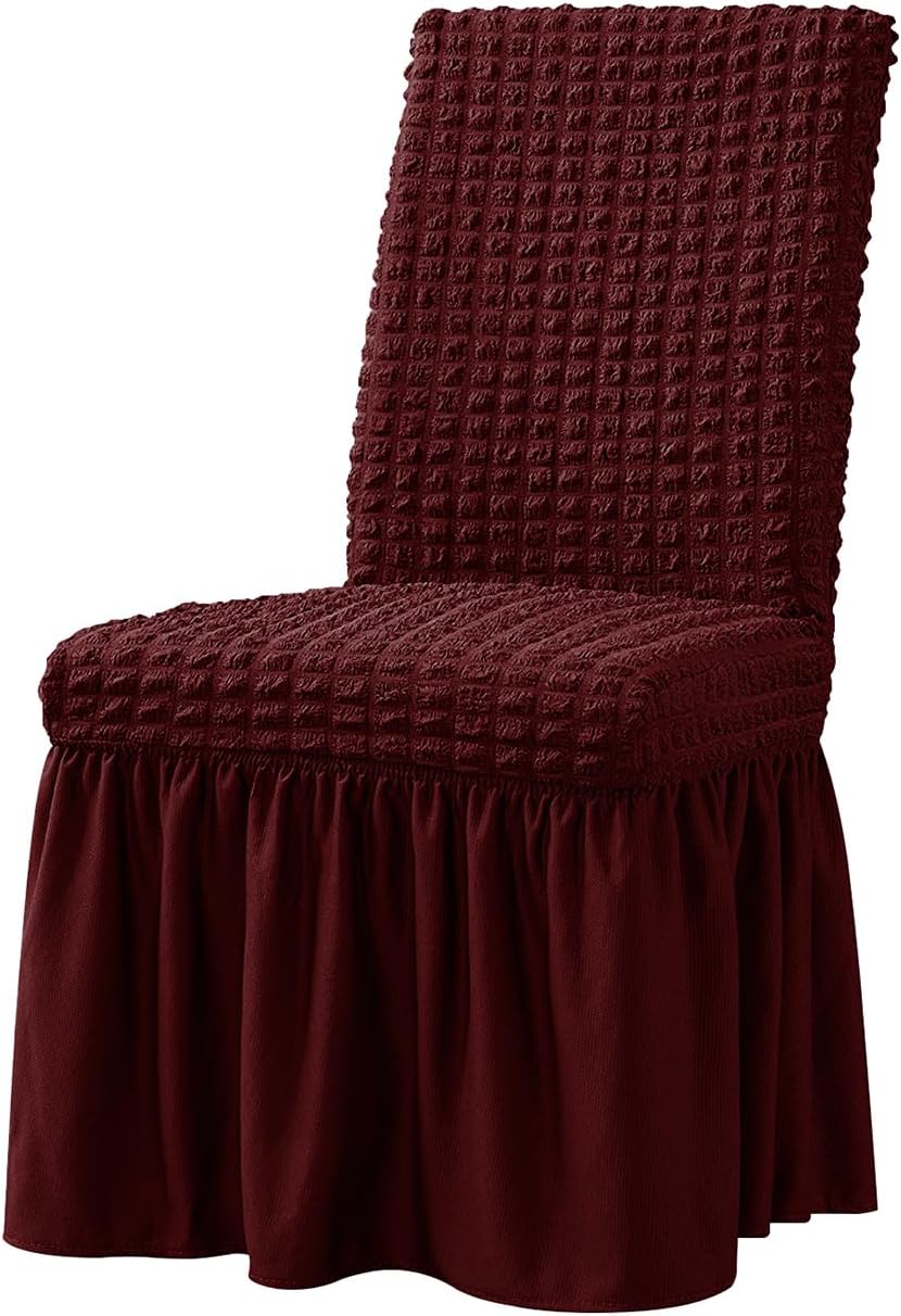 Great For different styles of furniture and decorations, this stylish bubble yarn skirted dining room chair cover has an elegant skirt design that brings a new twist to your home decor style. Features:Bubble Gauge Skirted Dining Room Chair Covers with stylish and unique design, injecting youthful vitality into your home space.The chair covers are made of Comfortable and Soft Fabric with delicate touch, bringing you a pleasant tactile experience.High elasticity dining room chair covers, stretchable, easy to stretch, Suitable For most chairs, 360° all-round fit chairs.Dining room chair covers with elastic sewn at the bottom are easy to install and fit tightly to the chairs, they can be easily put on and stay in place.Multiple colours of chair covers can be used For dining room, living room, wedding, banquet, hotel, bar, party, etc. to get a neat and tidy effect in your home space. Size: Chair back height: 18-23 inches (45-59cm) Chair back width: 15-17 inches (38-43 cm) Chair seat length: 15-17 inches (38-43 cm) Seat Width: 14-18 inches (35-46 cm) Cushion Thick: 1.5-4 inches (3.5-10 cm) Skirt length: 15 inches (38 cm) Package Includes: 2/4/6 pieces chair covers Attention:Due to the manual measurement of the Size, there is a 1-2 cm error, which is normal.Due to the different lights and monitors, there are thanks differences in colour, the specific colour is subject to the real thing.