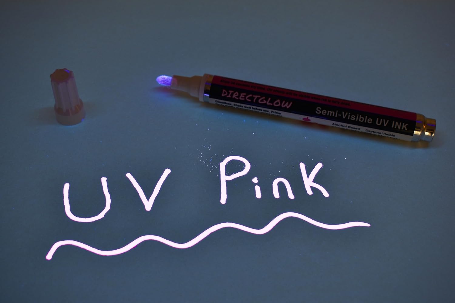 These hand made daytime visible UV security ink markers by DirectGlow are filled with bright highly pigmented ultraviolet ink. The colors stand out in daylight and glow exceptionally bright in blacklight. Constructed of aluminum alloy with a spring-loaded nib, these markers are tough and sturdy. A solid plastic snap on cap keeps everything safe when not in use. Alcohol based, designed to dry fast and be very tough to remove which makes them great for security applications like admissions control (marking hands to verify entry), coding, cataloging, marking your belongs, marking mechanical parts and so much more. Also well suited for recreational use like glow parties, blacklight games, escape rooms, promtional giveaways among others. Proudly made by hand in our shop right here in the USA. Best viewed in low light or dark, our ink is skin safe when used as directed. Does not wash off easily and very tough to remove. Works best on porous or textured surfaces. Ultraviolet black light required. Ink does not glow in the dark on its own. Nontransferable once dry making it ideal for application to an already printed surface. Please carefully note the inks in these markers is alcohol based. As such it should not be applied on or near sensitive areas like eyes, mouth, nose and similar. Allow about 30 seconds dry time after application. Colors will not show their full blacklight glow until ink is fully dry. Inks are less visible when applied to skin, but can still be seen in daylight. Color contrast for visibility in daylight and blacklight is most effective on a light to medium shade surface. Ink may not show as well on very dark backgrounds.