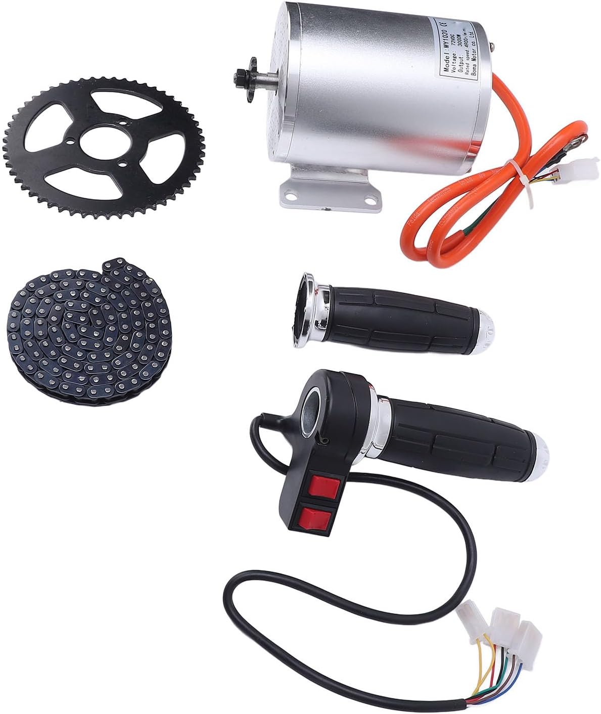 Specification: Item Type: Brushless Motor Kit Material: Aluminum Alloy, Plastic Rated Voltage: 72V Rated Power: 3000W Rated Speed: 4900rpm packing list: 1 x Motor 1 x Sprocket 1 x Chain 1 Pair x Throttle Grip Note: Check if the voltage and power match