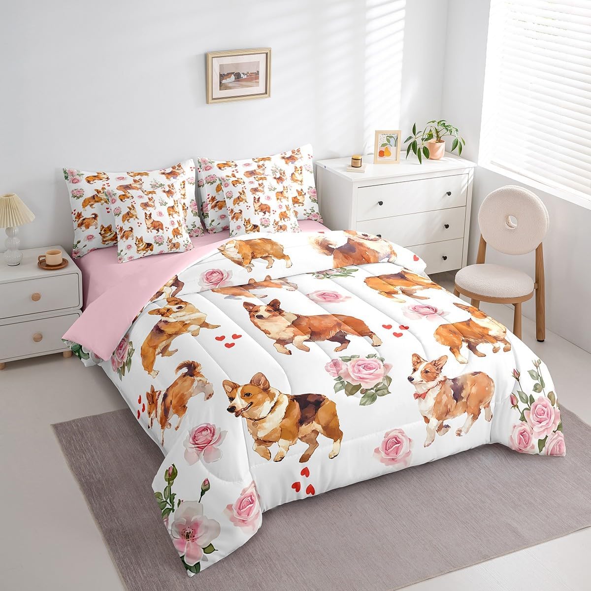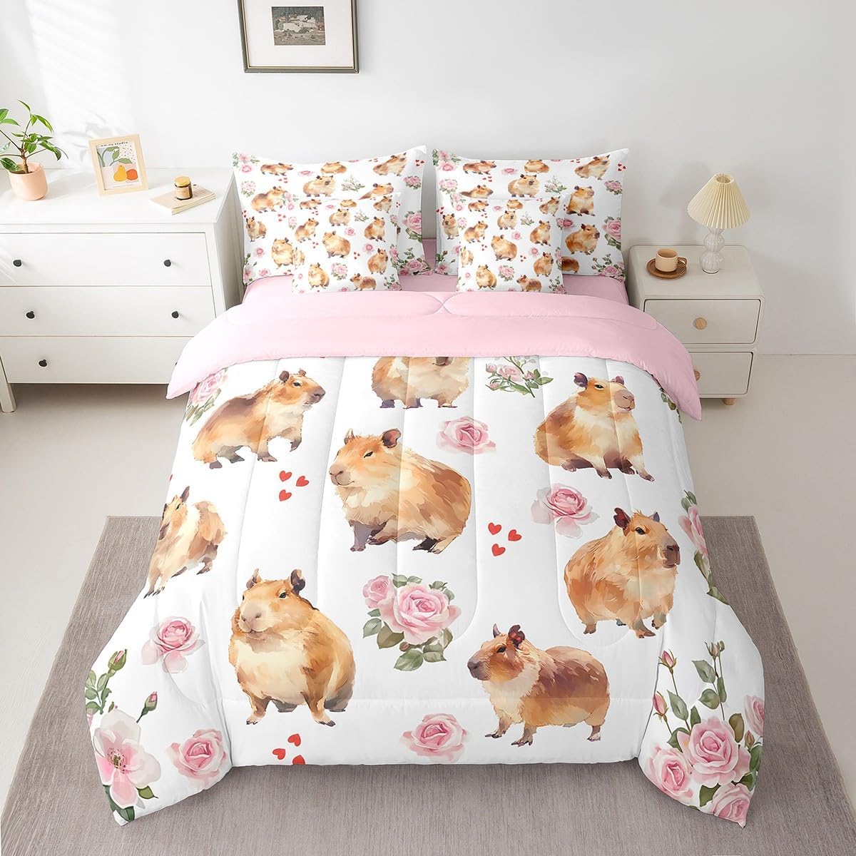 Erosebridal Capybara 7 Pieces Bedding Set Romantic Rose Queen Comforter Set with Sheets for Boys Girls Kids Room Decor Floral Capybara Bed in a Bag Cute Animal Bed Set