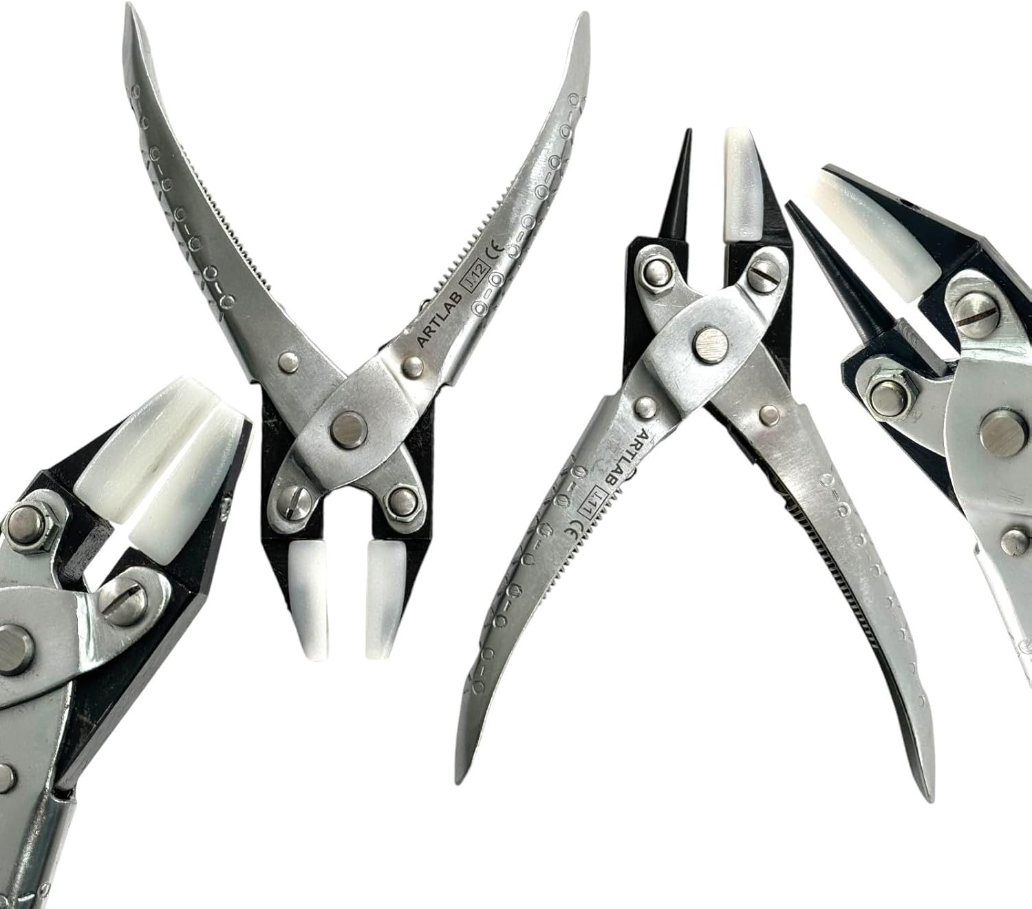 Options: 5" Parallel-action pliers with round & flat nylon jaw non-marring combination. 5" Parallel-action pliers with smooth non-marring nylon flat jaws. 6" Parallel-action pliers with smooth non-marring nylon flat adjustable jaws. 5" Parallel-action pliers with smooth chain nose, non-serrated jaws.. Parallel-Action Design: The parallel-action mechanism ensures that both jaws close simultaneously and evenly, providing exceptional precision and control. This feature is particularly important for delicate tasks, as it prevents slippage and ensures that the wire or other material is not damaged. The consistent grip allows for precise manipulations, making it easier to create intricate shapes and designs. (#J12) Smooth Nylon Flat Nose: Ideal for a variety of jewelry-making tasks, including bending, shaping, and forming wires, sheets, and other components. The non-marring smooth nylon flat nose design helps to prevent scratches and other damage to your workpieces. (#J13) Adjustable Nylon Jaws: The adjustable nylon jaws of these pliers are a unique feature that sets them apart from other flat nose pliers. This innovative design allows you to customize the grip and pressure applied to your work, ensuring optimal precision and preventing damage to delicate materials. The nylon jaws are also gentle on delicate surfaces, preventing scratches and other damage. (#J14) Smooth Jaws: The smooth, polished jaws minimize the risk of scratching or damaging delicate materials, allowing you to work with confidence. This is especially important when working with precious metals and gemstones, which can be easily scratched or marred. Ergonomic Design: The ergonomic design of these pliers makes them comfortable to use for extended periods of time. The handles are shaped to fit your hand naturally, reducing fatigue and strain. The non-slip grips provide a secure hold, even when your hands are wet or sweaty. High-Quality Construction: These pliers are made from durable materials, ensuring that they can withstand the rigors of everyday use. The materials used in the construction of these pliers are carefully selected to provide the necessary strength and durability, while also ensuring that the pliers are comfortable to use. Versatile Tool: Suitable for a wide range of jewelry-making tasks, including bending, shaping, forming, and cutting wires, sheets, and other materials.
