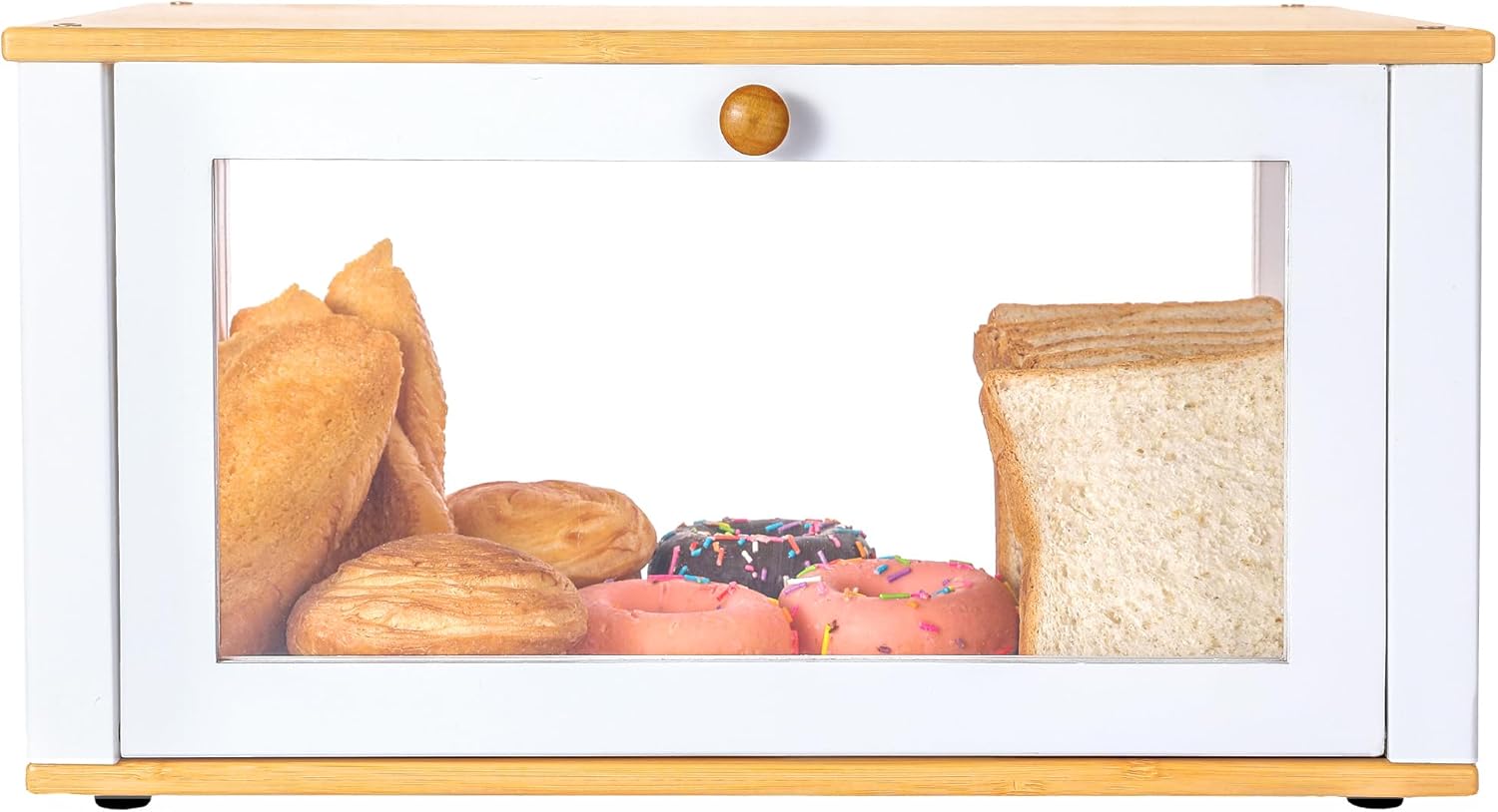 Design concept: Pay attention to the details and functions of the design, provide a better user experience, and Realize multiple uses of the product and suitable for various scenarios. Feature: -Transparent wave pattern acrylic door is more beautiful and retains the privacy of personal belongings storage. -The superposition design can make the box become a multi-layer storage cabinet, while the foot pads are non-slip and waterproof, it prevents the boxes from sliding down after being superimposed. -Large use area on the top side, preventing objects from falling. -Beautiful appearance is also the best gift to give someone. Installation: The storage box installation is very simple, only need to install 4 boards, foot pads, handle. We have already assembled the difficult part, making it easier for you to assemble. Specifications: ●material:bamboo ●Package quantity: 1 single layer ●Size of Bread box:16.53”(L)*9.84”(W)*8.26”(H) ●Internal storage size:15.74”(L)*9.45”(W)*6.69”(H) ●Product Weight:6.1bls(2.78kg) Notes: -Clean before use, wipe the protective Granular film on the door panel with a cleaning cloth. -Do not expose to the sun for a long time, and do not soak the bread box in water for a long time.