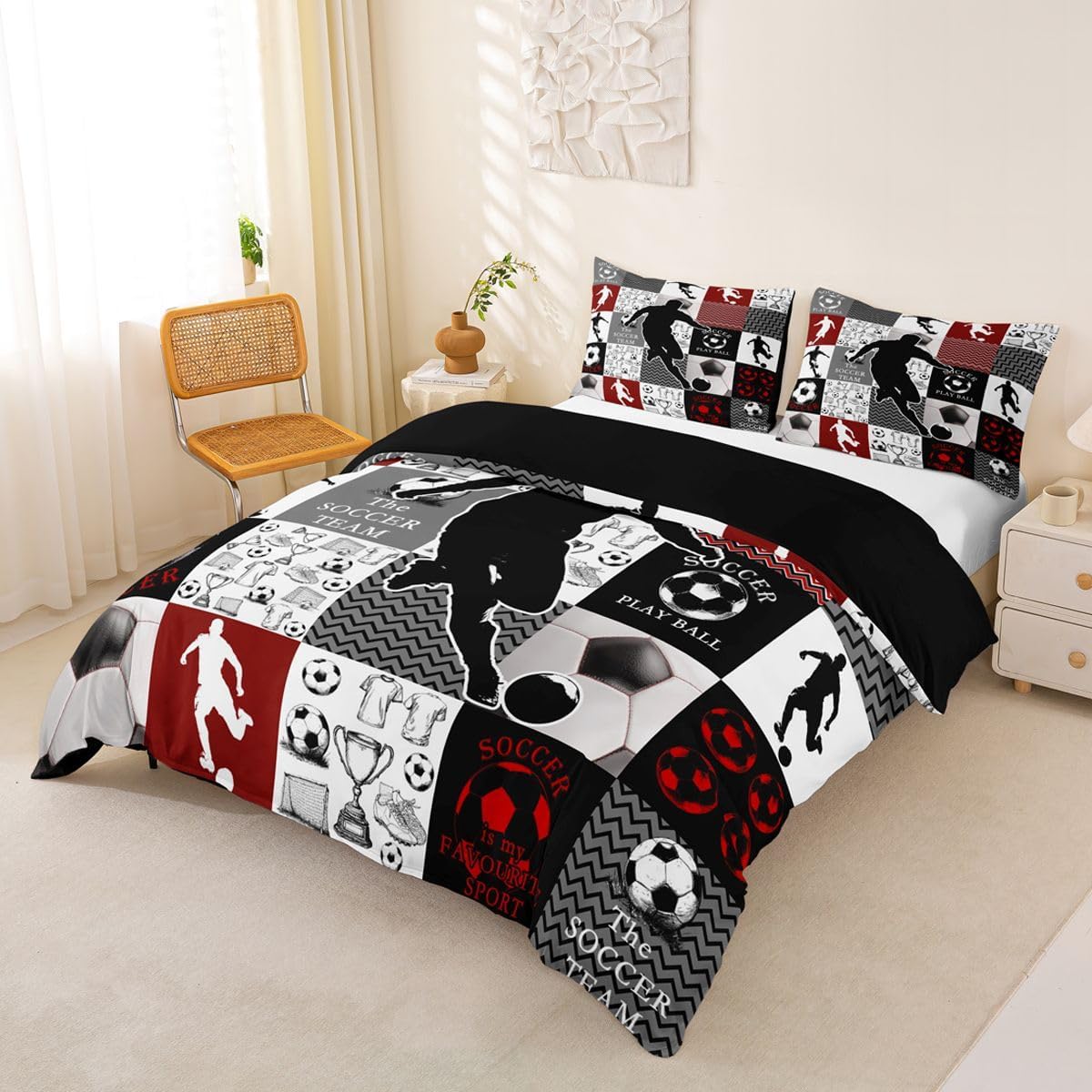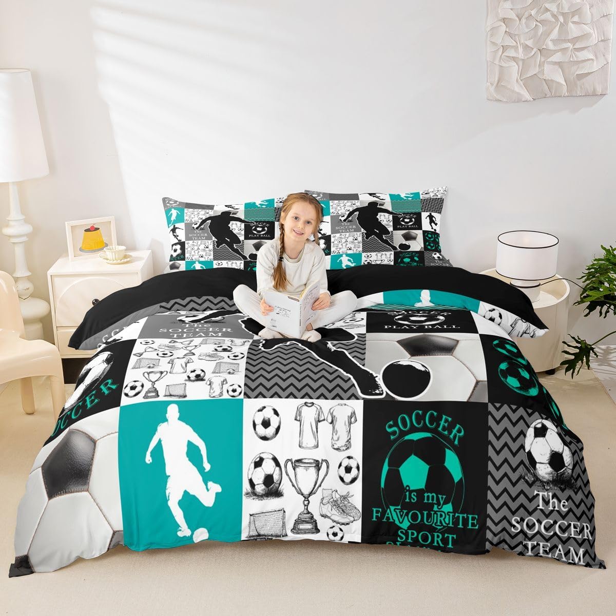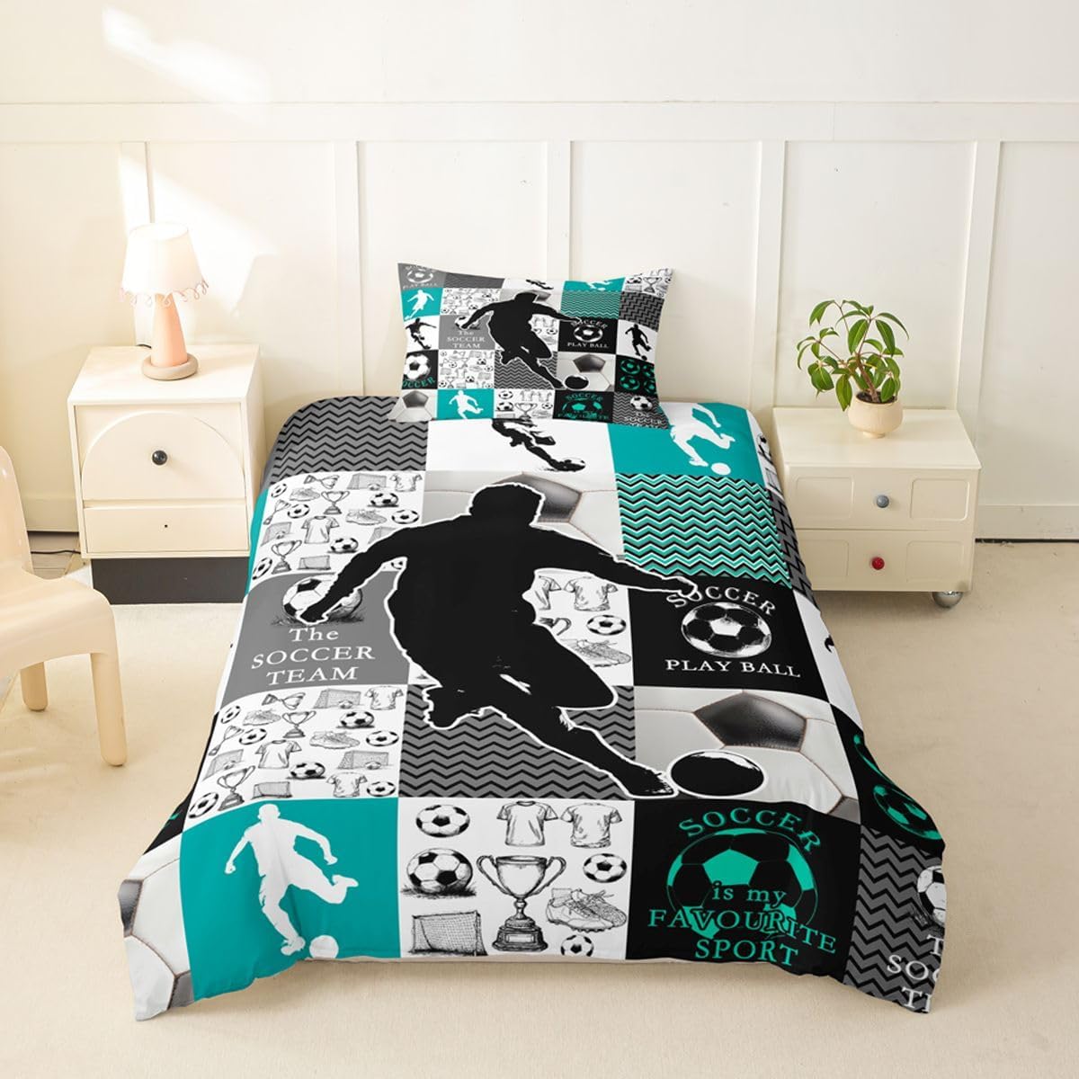 Feelyou Kids Soccer Duvet Cover Queen Size Football Bedding Set Boys Girls Soccer Ball Pattern Gray Comforter Cover Set Sports Theme Bedspread Cover(No Comforter