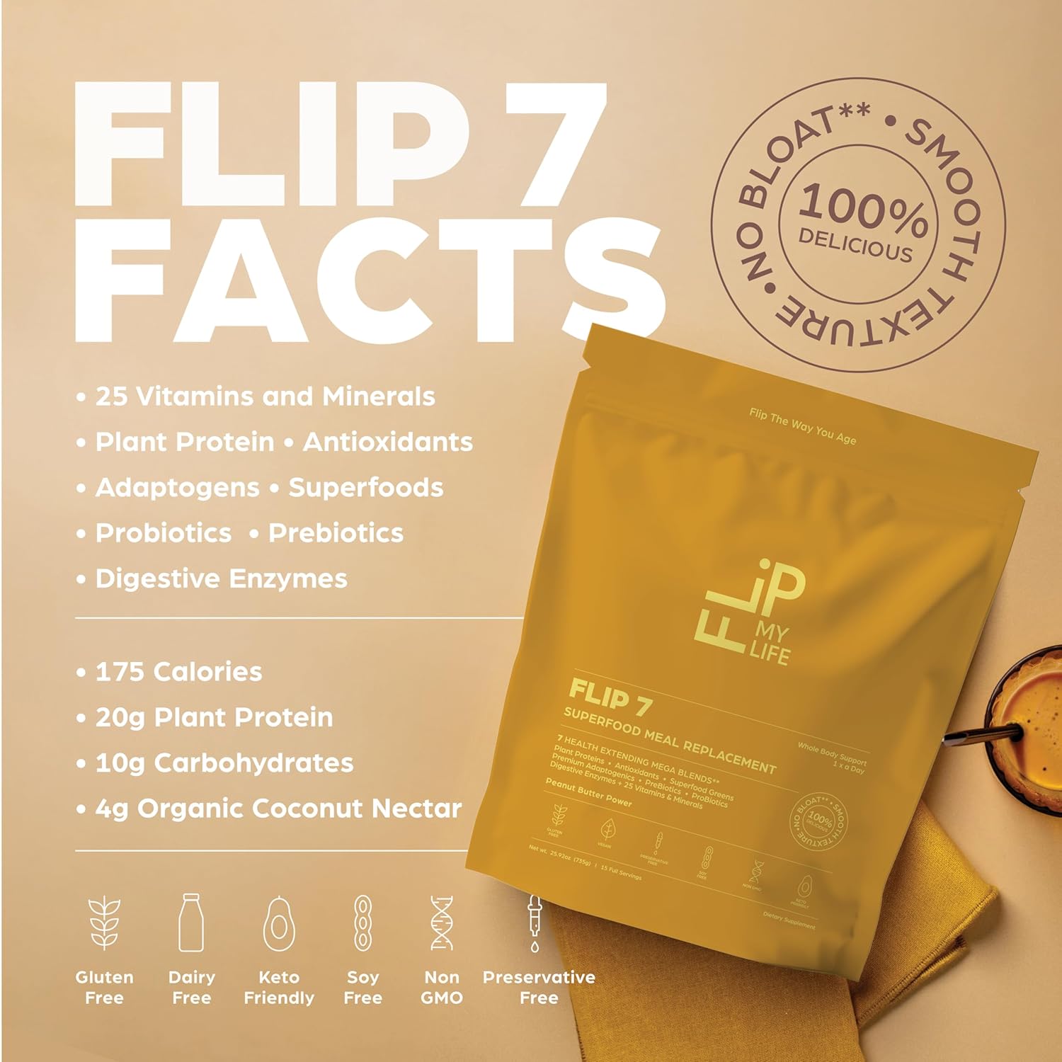 Meet Flip 7 Peanut Butter Power: the smooth, plant-based superfood shake formulated for no-bloat and built to flip the way you feel, look and age. Each serving delivers 20 grams of clean, vegan protein plus 85 nutrient-dense ingredients that support energy, gut health, digestion, metabolism, immunity, brain clarity, lean muscle, body aches and mood. Created by a medical doctor and holistic anti-aging specialist and independently, third party tested for purity. Powered by 7 synergistic blends including protein, premium adaptogens, superfood greens, pre and probiotics, digestive enzymes, antioxidants plus 25 essential vitamins and minerals, Flip 7 is your complete daily wellness stack in two creamy, delicious scoops. Designed for real results, it helps keep you satiated, curbs cravings, and helps keep energy steady and digestion moving. The Peanut Butter Power flavor hits rich, smooth, and satisfying without the heaviness or chalky aftertaste of traditional protein powders. Whether blend it with water and ice or put it in your favorite smoothie, or use it as a clean post-workout meal replacement, Flip 7 helps you Flip the Way You Feel. Go from tired to energized, bloated to balanced, and stressed to strong! Try one shake a day and flip the way you feel!
