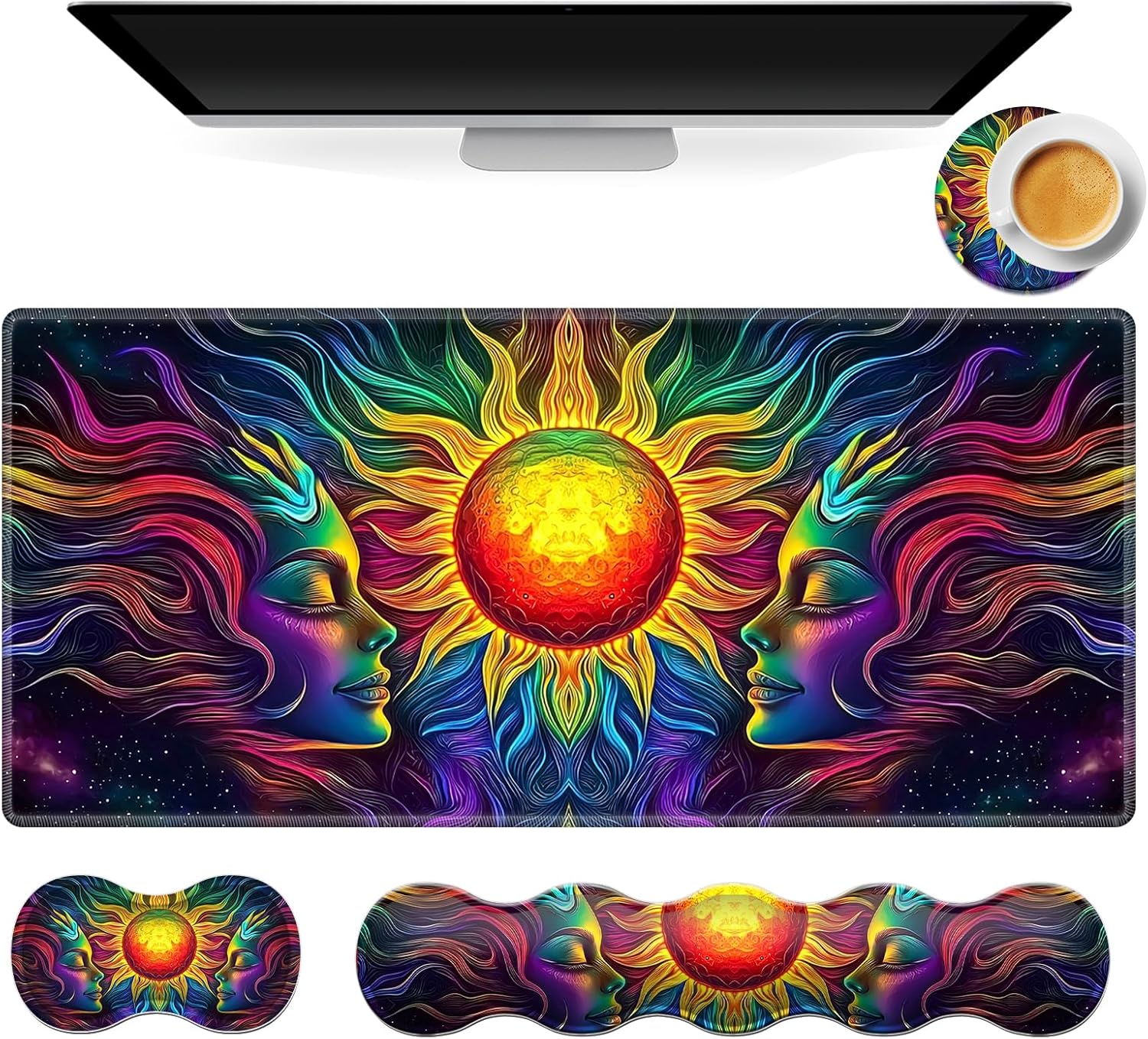 Gaming mouse pad wrist support set, brightens up your workspace with fun and beautiful design; pretty and well made, work or gaming with more comfort! The product includes: 1 X Mouse pad 1 X Keyboard wrist rest 1 X Mouse wrist rest 1 X Cup coaster Key Features: This extra large mouse pad wrist support set make the tabletop look tidy and everything is in order, mat helps to enhance the work efficiency in office. Perfect for working or gaming. The large size also protects your desk surface against scratches and damage! Mouse Wrist Support and Keyboard Wrist Rest Ergonomic memory foam and just the right height keeps your wrist in a natural position rather than a twisted angle. Help minimize stress on wrists as well as provide comfort and support,make typing, learning, playing games easier. Non-slip textured bottom with the natural rubber material to prevent gliding or unnecessary movement. Memory foam filling, comfortable, lightweight and durable, no deformation. Adopt soft and breathable materials to provide lasting support for your wrist. Stitched Edges: Delicate stitched edges can prevent wear, deformation and degumming in prolonged use. Design for security and durability, and enhances the aesthetic and lifespan of the mouse pad Our unique designs on smooth fabric are not only a delight for your wrists, but also for your eyes. Get rid of the dull black mouse pads and bring some colour and fun back into the office.