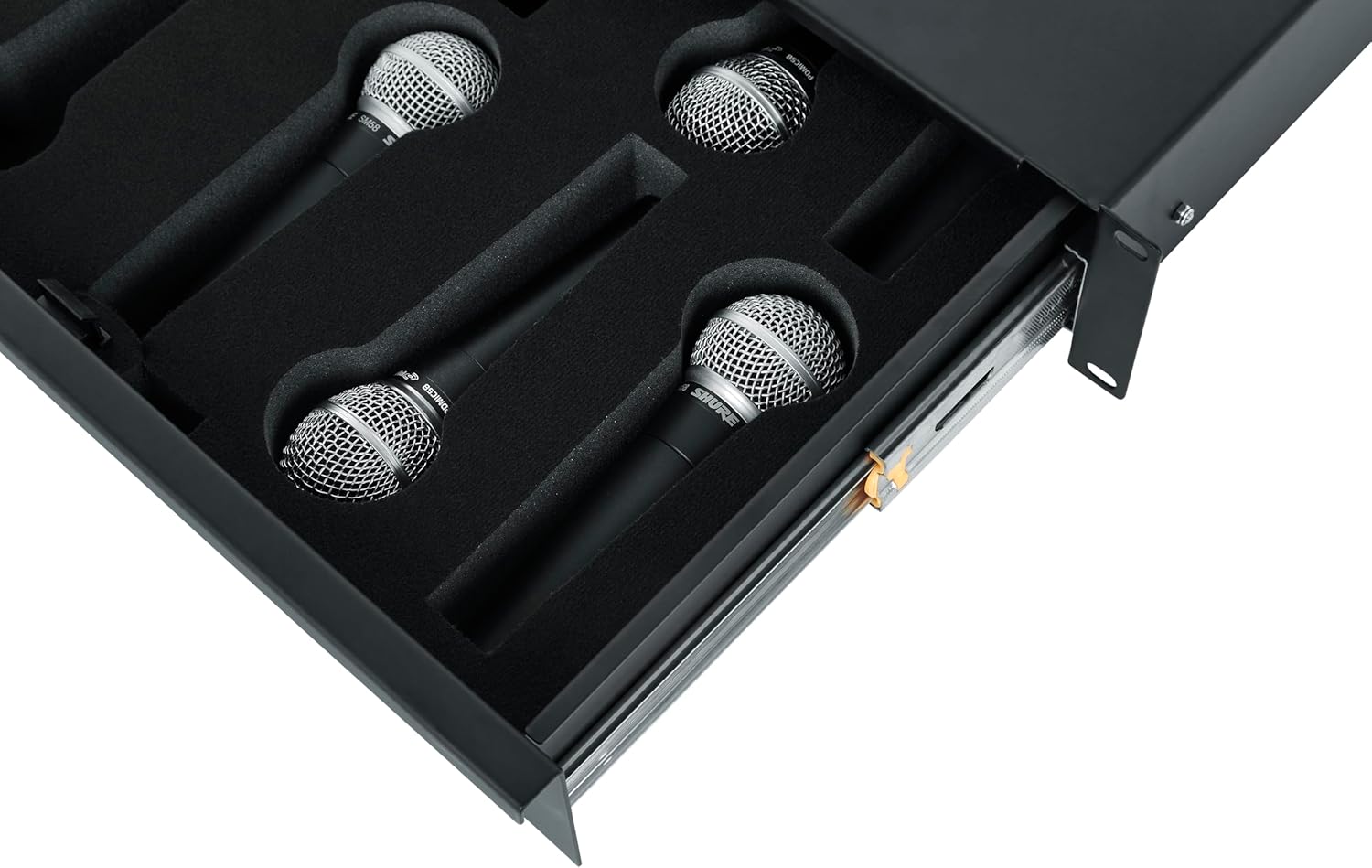 • 2U Rack Drawer for Wired Microphones: Designed to store up to 10 hard-wired microphones securely in a compact, rack-mounted format.