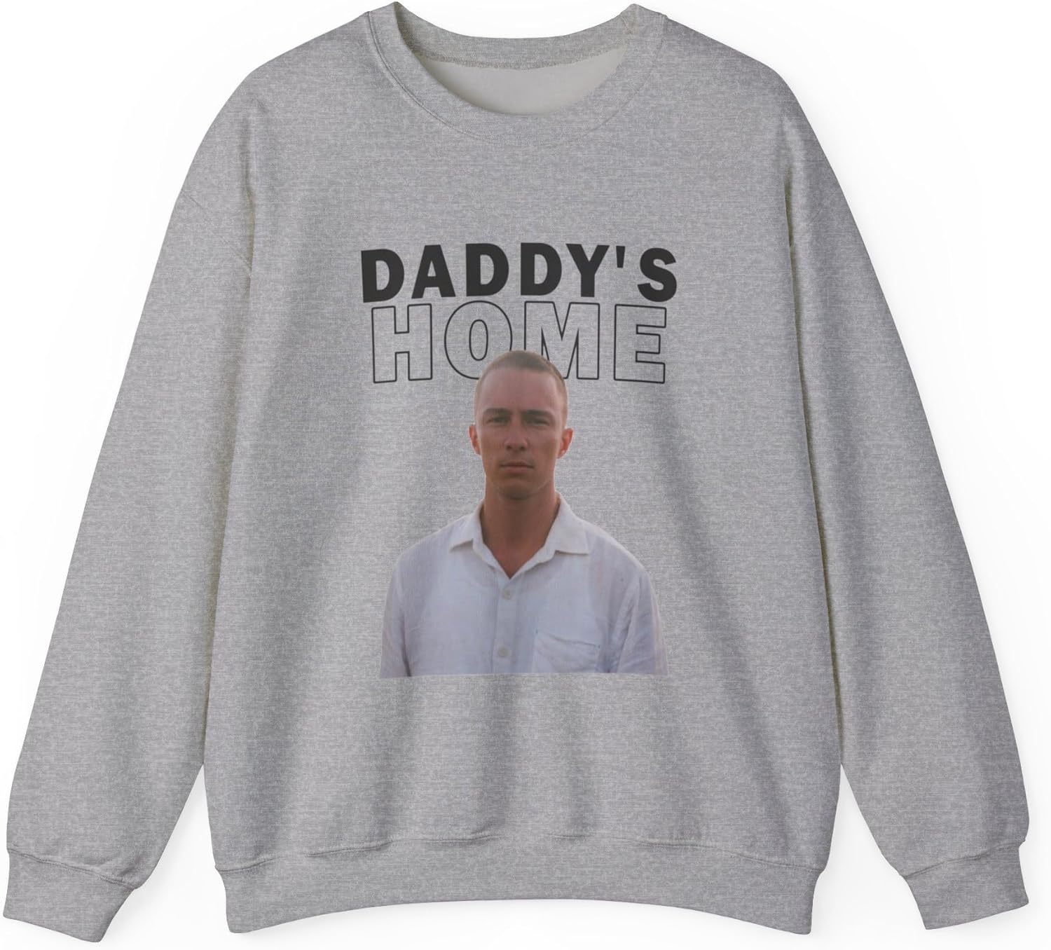 Daddy's Home Drew Sweater , Starkey Sweatshirt Ideal for any situation, a unisex heavy blend crewneck sweatshirt is pure comfort. These garments are made from polyester and cotton. This combination helps designs come out looking fresh and beautiful. The collar is ribbed knit, so it retains its shape even after washing. There are no itchy side seams on these sweaters. .: Made with a medium-heavy fabric blend of 50% cotton and 50% polyester (8.0 oz/yd² (271.25 g/m²)), this sweatshirt feels cozy and is the perfect choice for those colder months. .: The classic fit along with the crew neckline deliver a comfy wearing experience with a clean-cut style. Meanwhile, the double-needle stitching at the shoulder, armhole, neck, waistband, and cuff seams add top-tier durability. .: Say goodbye to itchiness thanks to the gray, pearlized tear-away label. .: Made using 100% ethically grown US cotton. Gildan is also a proud member of the US Cotton Trust Protocol ensuring ethical and sustainable means of production. The blank shirt's dyes are OEKO-TEX-certified dyes with low environmental impact. .: Fabric blends: Heather Sport colors - 60% polyester, 40% cotton .: Embroidery decoration method available on left chest or center chest