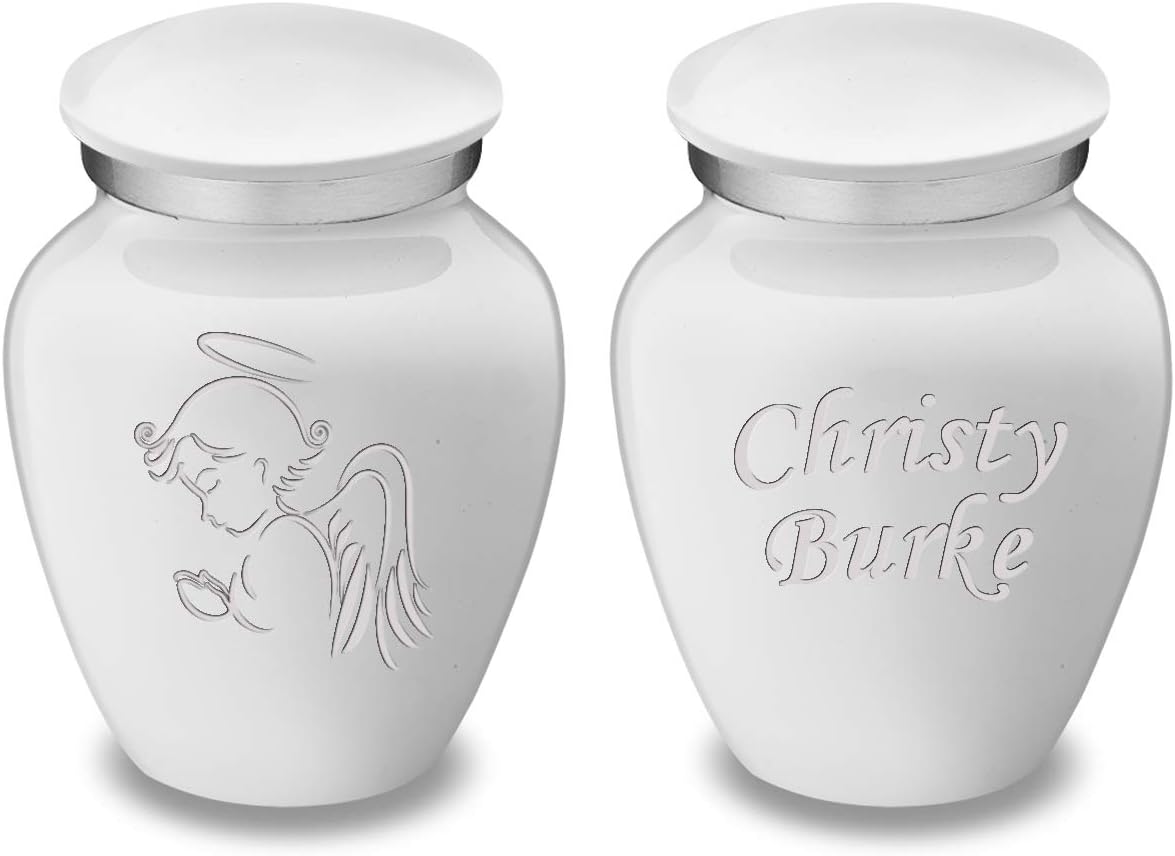Honor the memory of your loved one with the Embrace Angel Cremation Urn for Ashes. This beautiful urn displays a praying angel. This is a perfect resting place for someone who embodied peace, love, and harmony. This gorgeous urn also has the option available for custom engraving to offer personalized tribute. Type up to three lines of text with any of our available fonts. Note: all custom engraved text is final and will be engraved as submitted. Keepsake Embrace Urns are simple yet elegant in their design; drawing from the classic urn combined with modern motifs. A Keepsake Embrace Urn is 3.5 Cu Inches (appropriate for sharing). Size: Keepsake Small Urns Dimensions: 3"H x 2.25"D Capacity: 3.5 cu. Inches Material: Alloy Opening: Threaded lid Velvet Bag: Not Included