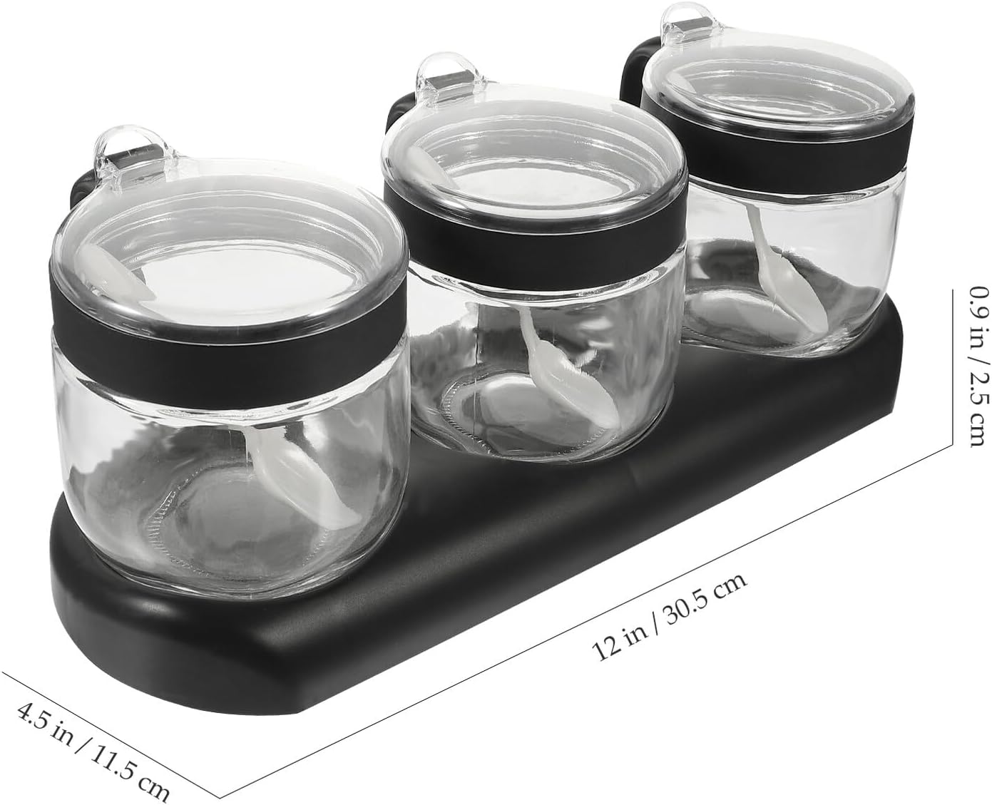 Package Include 3 x Spice Jars 1 3 x Spoons Characteristics - Color: Black -Material:Glass, PP and -Note: The volume of each spice container is 350 ml countertop seasoning containers. -This Seasoning Bottle is easy to clean. Perfect kitchen condiment storage helper. It can be used to hold a variety of condiments: pepper, sugar, salt glass salt container. - Size: 30.50X11.50X2.50cm/11.99X4.52X0.98in -Product Info:Seasoning bottle set -Made of premium and glass material, the product is and practical in use. -Suitably sized and easy to hold and sprinkle the exact amount of seasoning you want in your food. -Equipped with lid design, can close the air barrier when not in use, keep the seasoning clean and dry seasoning storage container. -Widely using range, suit for household kitchen, restaurant, dining room, it is small and portable, thus also a good accessory for the camping and picnic glass seasoning jar.Goods Informationmulti-use seasoning pot This is a premium Seasoning Container.clear seasoning container The small and medium spice bottles are practical accessories for your home use, and they can be applied for restaurants, hotels, cafeterias, canteens or other food service places, and they are also nice supplies for some outdoor activities, like camping, picnic, hiking and more