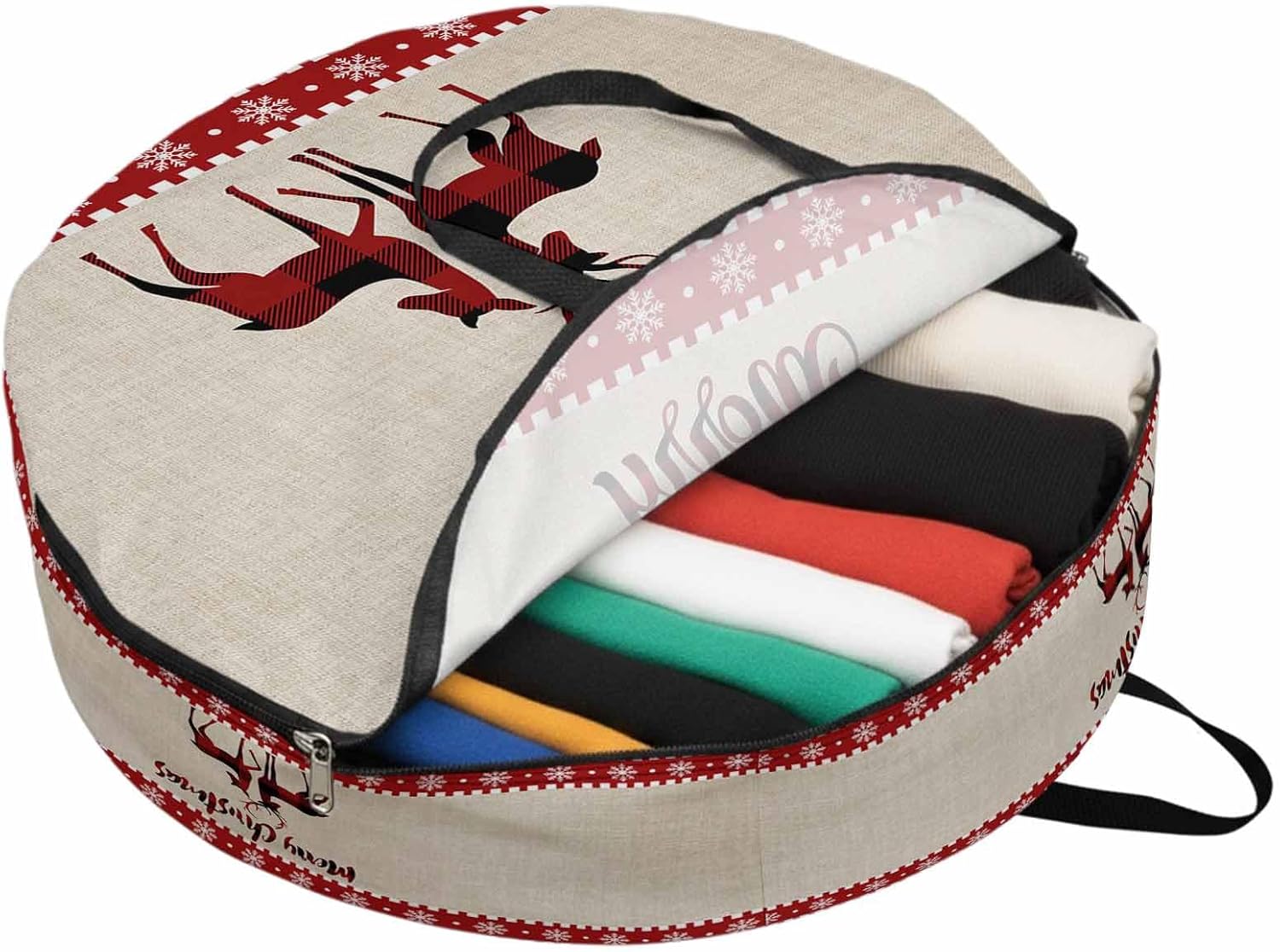 Reclaim Your Closet Space with the Round Storage Solution! Material: polyester Diameters: 24 inch, 30 inch, 36 inch Depth: 7 inches Package Includes: Round Storage Bag One Bag, Endless Possibilities: Whether you are swapping out your summer wardrobe, moving into a new dorm, or packing away holiday decorations, this bag has you covered. The circular design is uniquely suited for: Bedding: Comforters, quilts, sheet sets, and oversized pillows. Clothing: Winter coats, sweaters, and bulky ski gear. Home Decor: Holiday wreaths, garlands, and floral arrangements. Outdoor Gear: Camping blankets, sleeping bags, and beach towels. Dual Zippers: The high quality double zipper design allows the closet organizer to open wide from both sides, making it effortless to load and unload even the bulkiest comforters or wreaths. Reinforced Handles: Sturdy, reinforced handles are securely stitched to provide extra strength and a comfortable grip when carrying heavy loads or pulling the bag from under a bed. Clear Label Pocket: A transparent built-in label holder allows you to quickly identify the contents of each bag without ever having to unzip it, keeping your storage perfectly organized.