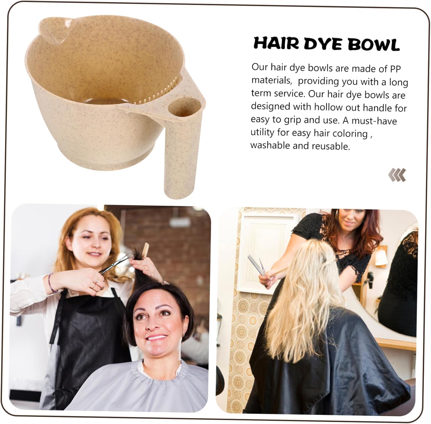 Package List 2 x hair dye bowlsCharacteristics - Size: 17.00X9.00X8.00cm/6.68X3.54X3.14in tint bowl- Color: Beige hair color kit-Material:PP tinting bowl- Each hair tinting bowl features an ergonomic handle design which provides a comfortable grip color bowls for hair salon.- Our hair dye bowls are for salon, hairdressing, DIY, home dyeing, highlights, or others color mixing bowls for hair salon.- Mixing bowl is made of PP material, sturdy and , ensuring durability and dependability color bowls.- These color bowls can be used multiple times, essential accessory for DIY hair coloring mixing bowls with handles.- You can clean the hair dye bowls without too much effort and time, rinse it with clean water hair dye mixing bowl with handle.Goods Descriptionmixing bowls with handles A must-have utility for easy hair coloring , washable and reusable.hair dye bowl Our hair dye bowls are designed with hollow out handle for easy to grip and use.hair tinting bowl Our hair dye bowls are made of PP materials, hard, wear-resistant and , providing you with a long term service