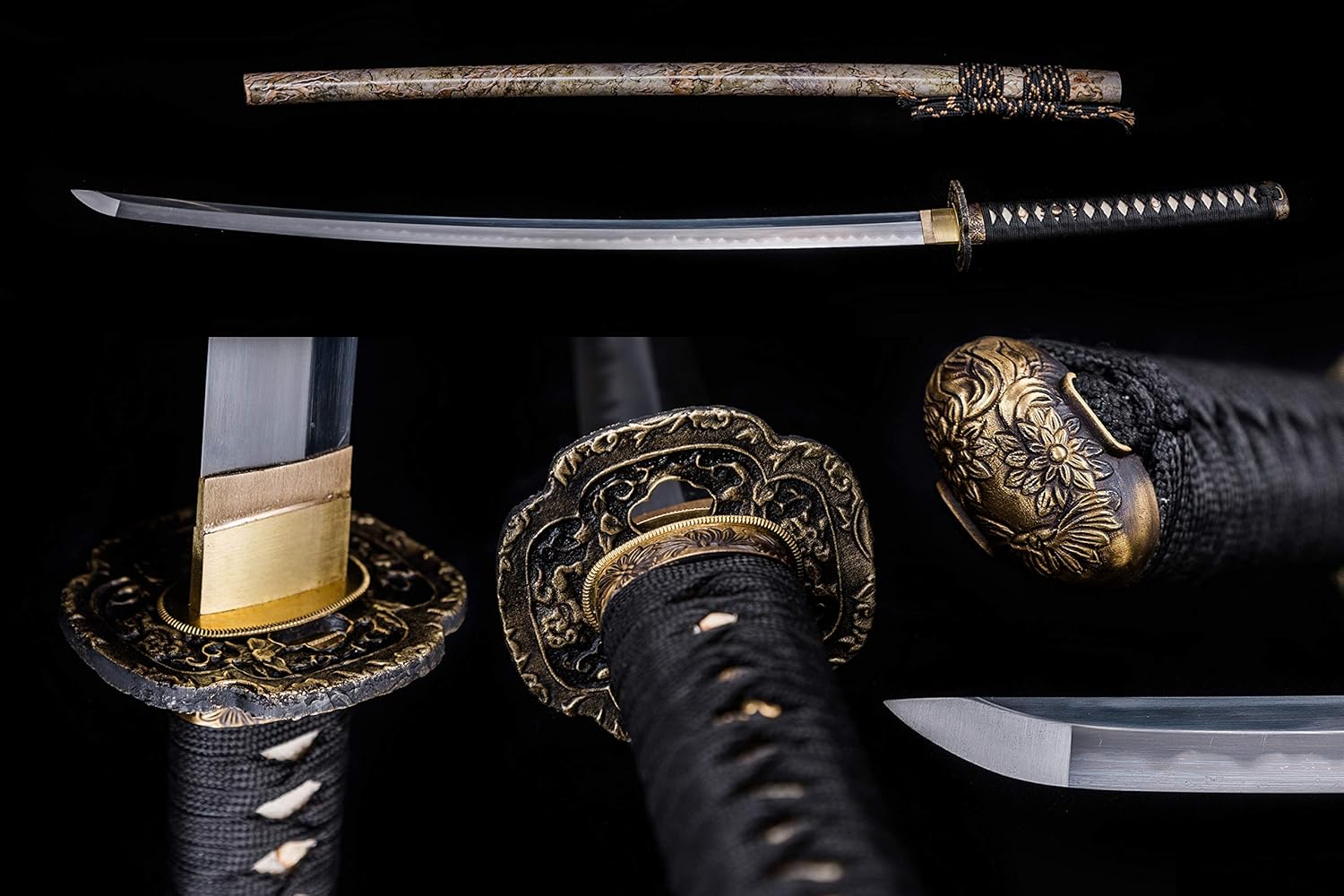 We are one of the world-renowned Longquan tool manufacturers. Longquan Bo Yu Sword Co., Ltd. sells all products on Amazon.com is our company's new products. Here you can find what you like! The company can easily customize your SWORDS for you. Project details: BOHIHYU Japanese Samurai Katana Sword-is it composed of Damascus steel. Damascus steel through Heat Tempered/Clay Tempered deal with+Handmade grinding+folder steel+true tangent,Full Tang, sharp edge and functional Approx. BOHIHYU Damascus Steel-he is like a beautiful pattern in the night sky, the magical pattern is simply the natural beauty of artificial carving.- The samurai sword made of BOHIHYU Damascus steel has excellent toughness and sharp blade. - It is the king of weapons in the era of cold weapons and is the best of the samurai tool collection industry.- BOHIHYU Handmade Japanese Samurai Blade blade-is it composed of T10 (1095) steel. T10 (1095) steel through Heat Tempered/Clay Tempered deal with+Handmade grinding+true tangent,Full Tang, sharp edge and functional Approx. BOHIHYU T10(1095)steel-is a high-quality high-carbon steel with a carbon content of 1% and a hardness of more than 60HRC after heat treatment. The samurai sword made of BOHIHYU T10(1095) steel has excellent toughness and sharp blade. - "Carbon steel is king". T10(1095)steel In the cold weapon age, it is the most favorite steel for casting warrior knives. - TSUBA FUCHI KASHIRA MENUKI Antique copper fittings And copper Habaki BOHIHYU Japanese Samurai Katana Sword DIMENSIONS- overall 40.5"L x 1.25"W x 0.27Inch Thick (about3 lbs.), 28.3" blade and10.2" handle ". Weight: 3 pounds, Uses: ancient Chinese cold weapons, collection, self-defense, gifts, martial arts fitness, fine furniture,