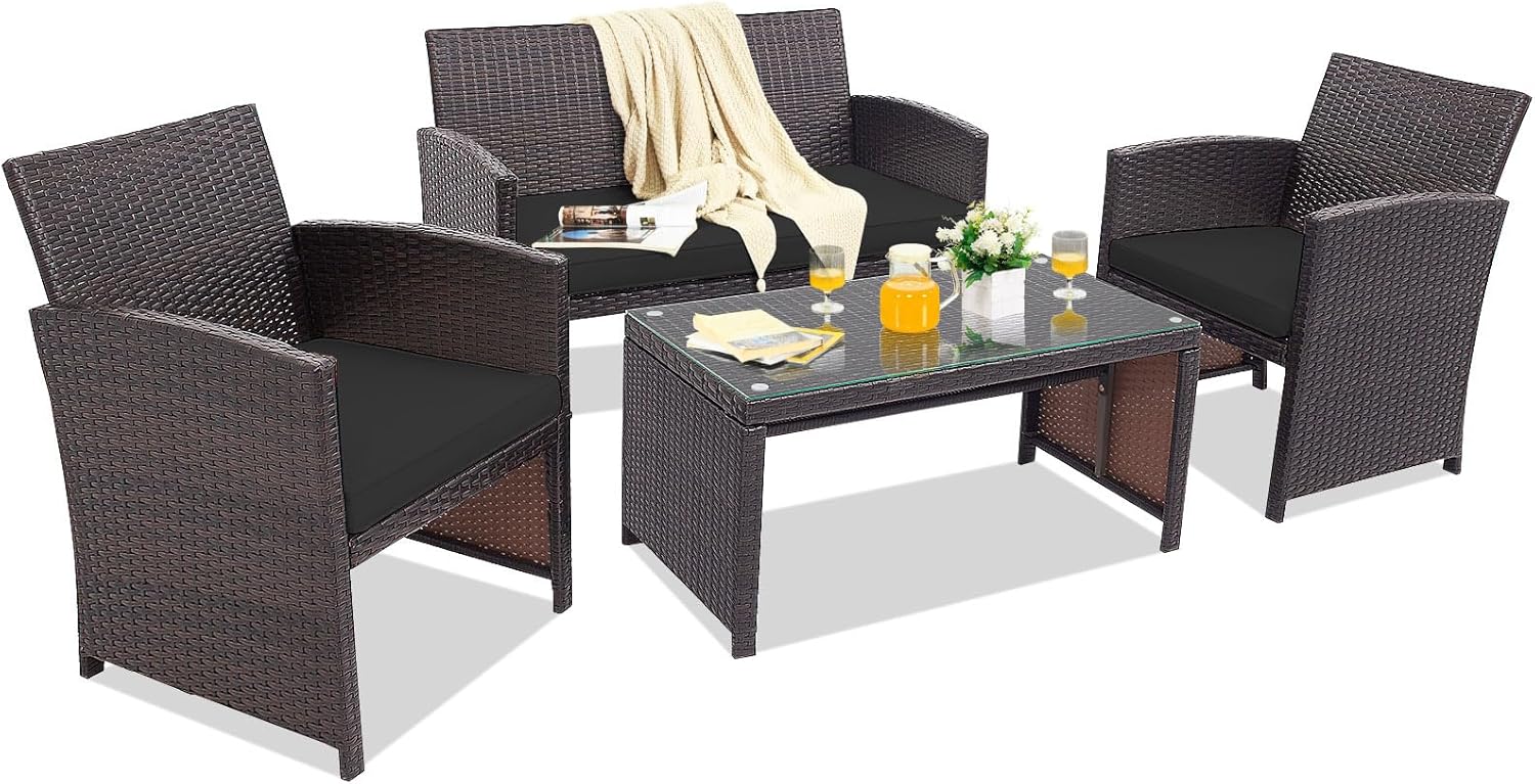 Description: Crafted from premium mix gray PE rattan, the outdoor furniture set combines sunproof durability with elegant design. Featuring comfortable seat cushions, both the loveseat and chairs ensure ergonomic support and offer more relaxation to you. The chic coffee table with a tempered glass top adds sophistication and easy maintenance to your space. Sturdily built with a reinforced metal frame, this versatile wicker set adapts effortlessly to any backyard, porch, or balcony, enhancing your outdoor experience with lasting comfort and charm. Features: Handwoven mix gray PE rattan for extended elegance Ergonomic backrest and armrests support natural, comfortable sitting posture Soft cushions with elastic filling enhance comfort level Zippered cushion covers allow easy cleaning Tempered glass tabletop for simple maintenance Sturdy X-shaped metal frame provides strong stability Single chair supports up to 400 lbs for reliable durability Loveseat holds up to 800 lbs accommodating 2 adults comfortably Specification: Color of Cushion: Black/Navy/Red/Turquoise/Off White Color of Rattan: Mix Gray/Black Material: PE Rattan, Metal, Polyester, Sponge, Tempered Glass Loveseat: 25” x 42” x 31”/63 x 107 x 78 cm (L x W x H) Armchair: 25” x 22” x 31”/63 x 56 x 78 cm (L x W x H) Coffee Table: 35” x 18” x 17”/89 x 46 x 43 cm (L x W x H) Seat Loveseat: 40” x 19”/101 x 48 cm (W x D) Seat Armchair: 20” x 19”/50 x 48 cm (W x D) Seat Height from the Ground: 13.5”/34.5 cm Backrest Height: 18”/46 cm Weight Capacity of Loveseat: 800 lbs/360 kg Weight Capacity of Armchair: 400 lbs/180 kg Weight Capacity of Coffee Table: 100 lbs/45 kg Net Weight: 63.5 lbs/29 kg Package Include: 1 x Loveseat 2 x Armchairs 1 x Coffee Table 1 x Loveseat Cushion 2 x Armchair Cushion 1 x Instruction