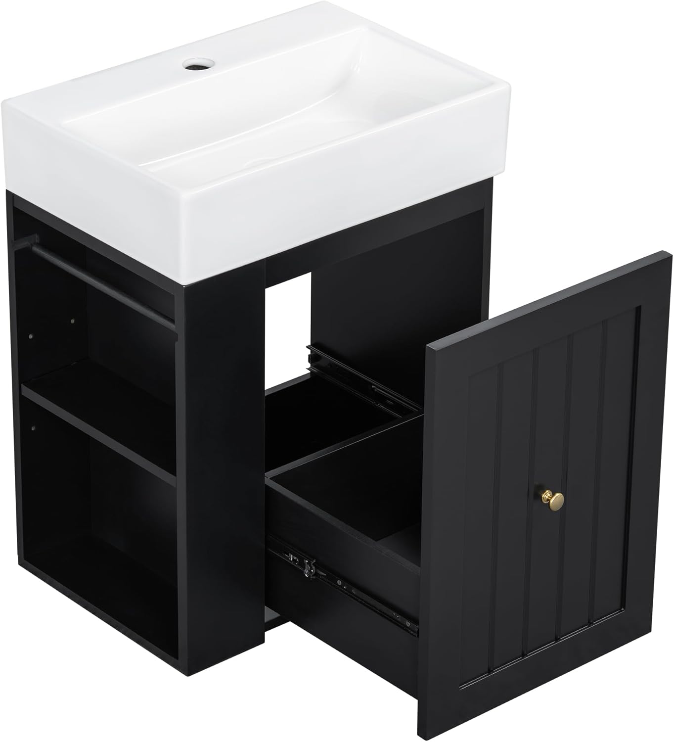 Product FeaturesCompact 20-Inch Design – Perfect for small bathrooms, powder rooms, or guest spaces without taking up too much floor area.Durable MDF Cabinet – Made of high-quality MDF board, offering a sturdy and stable structure for long-term use.Smooth Ceramic Basin – Integrated ceramic sink with a sleek surface, easy to wipe and keep clean.Large Functional Drawer – Spacious pull-out drawer provides convenient storage for toiletries and bathroom essentials.Additional Side Storage – The Side compartment is designed for holding paper rolls, towels, or other daily supplies.Side Open Shelf – Convenient side storage shelf offers quick access to daily essentials such as towels, paper rolls, or small bathroom items, keeping your space neat and organized.Smooth Drawer Slides – The large drawer moves effortlessly on durable metal slides, providing easy access to your bathroom essentials for everyday use.Wall-Mounted Style – Space-saving floating design allows you to mount the vanity on the wall, creating a modern look while keeping the floor clear for easy cleaning and a more open bathroom layout.DIY Assembly Required – Shipped flat-packed with all necessary parts and instructions; faucet not included.More InformationColor White/Green/BlackMaterial MDF Board + CeramicShape RectangularStyle ModernFinish Painted FinishMounting Type Wall-mountedNumber of Sinks Accommodated 1Sink Type Undermount; Drop-InSink Location CenterVanity Top Edge Type FlatEdge Thickness 4.8"Hardware Included YesAssembly Assembly RequiredCountry of Origin VietnamTop Depth 4.7"Ideal Use Bathroom, powder room, guest bathCapacity 200lbsCabinet Base 20x13.8x20.4 Inch