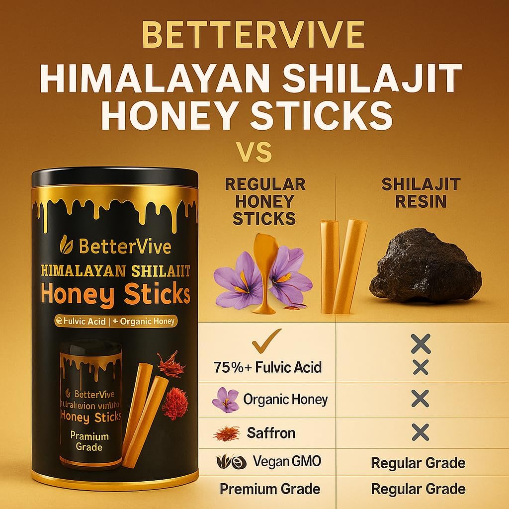 Unlock Ancient Himalayan Vitality with BetterViVe Pure Himalayan Shilajit Sticks – a premium blend of shilajit resin, organic honey, and saffron for maximum bioavailability and benefits. Sourced from the untouched Himalayan mountains, our lab-tested shilajit delivers 85+ essential trace minerals and over 75% fulvic acid, known for its powerful energy, immune, and cognitive support. Unlike traditional sticky resin, BetterViVe Shilajit Sticks are pre-measured and easy to consume. Simply take one stick daily, mix it with warm water or tea, or enjoy it directly for a natural energy boost. Our organic honey & saffron infusion not only enhances the taste but also amplifies the absorption of nutrients, making it an effortless addition to your wellness routine. ✔️ 100% Natural & Lab-Tested ✔️ No Artificial Fillers or Preservatives ✔️ Convenient Single-Serve Sticks for Daily Use Reclaim your energy, stamina, and overall well-being with BetterViVe Shilajit Sticks – your daily superfood for vitality and strength.