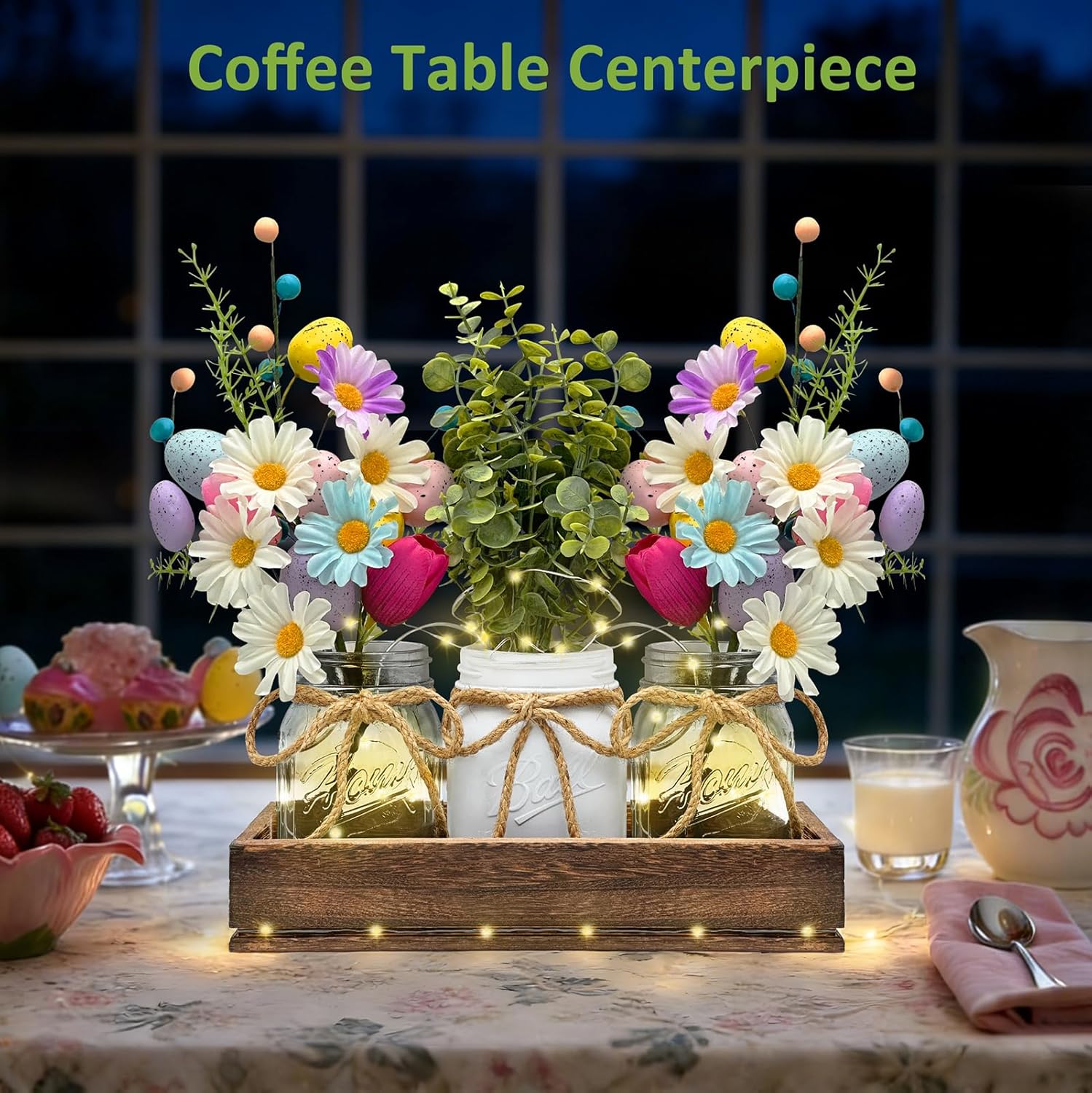 • Light Up Your Easter Day Night with Romance: This Easter mason jar centerpiece for table artfully combines warm LED lights with Easter eggs and flowers, casting a warm and cozy glow. Perfect as a stunning focal point on your dining table or as an accent on windowsills and shelves, it instantly infuses your home with a touch of farmhouse charm and festive warmth. As night falls, the gentle illumination resembles the starlight, allowing you and your loved ones to unwind in a serene, rustic ambiance