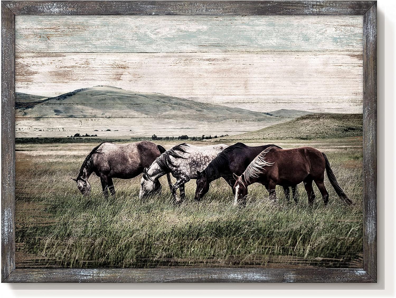 Horse Framed Wall Art Decor: Country Western Farmhouse Wood Painting Vintage Farm Painting Wild Animals Walking on Sprawling Grassland Rustic Artwork for Living Room