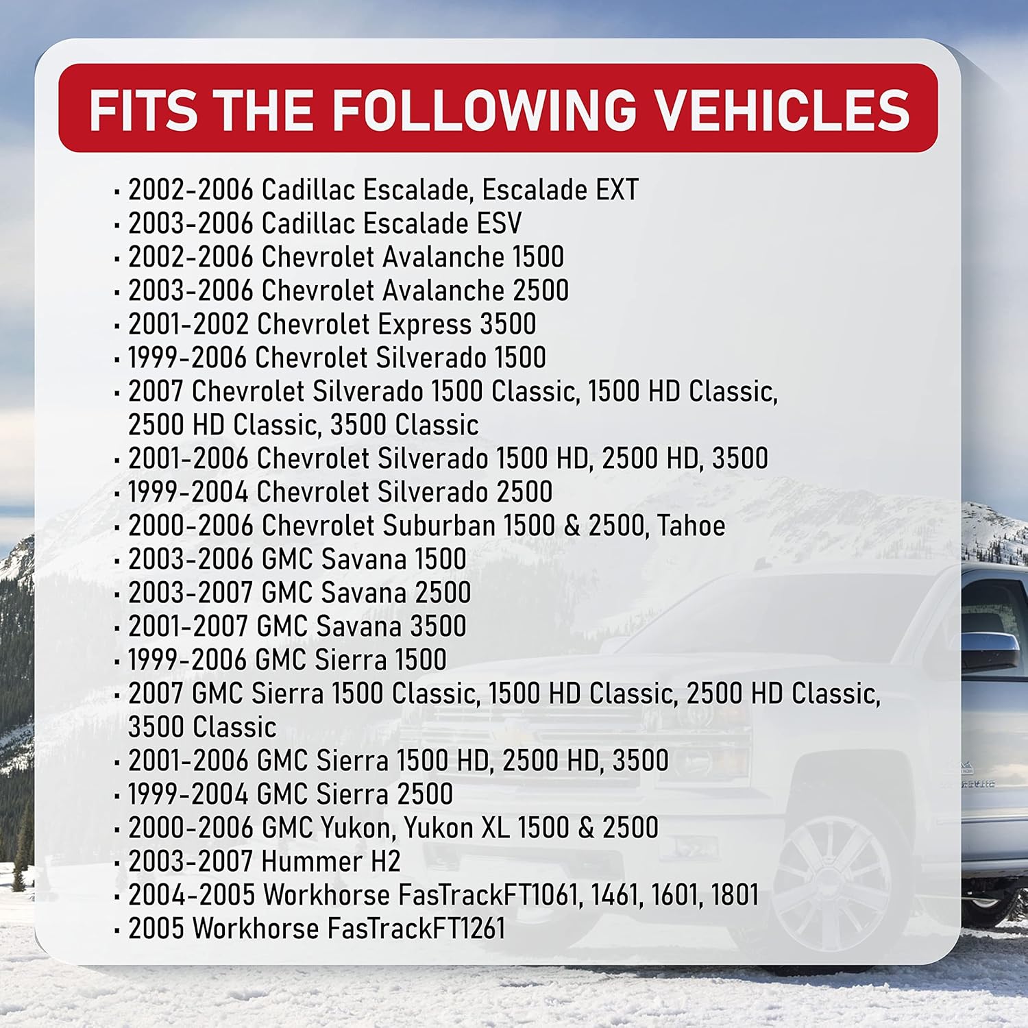 • Compatible with Chevrolet, GMC, and GM 4.8L, 5.3L, 6.0L, and 8.1L Vortec V8 engines. Suitable for various models including: 2002-2006 Escalade & Escalade EXT, 2003-2006 Escalade ESV, 2002-2006 Avalanche 1500, 2001-2002 Express 3500, 1999-2006 Silverado 1500, 2007 Silverado 1500 HD Classic, 1999-2004 Silverado 2500, 2000-2006 Suburban 1500, 2003-2006 Savana 1500, 2001-2006 Sierra 3500, 2000-2006 Yukon XL 2500, and more.