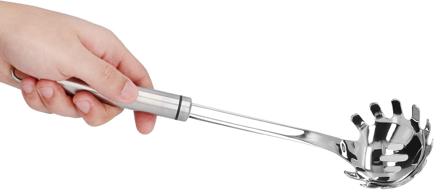 1. The noodle spoon is designed with a comfortable handle, made of stainless steel, and heat-resistant.2. Even in daily use, their design will not bend like plastic tableware and will not be easily deformed.3. Will not crack like wooden kitchen tools, and will not like other metal appliances, and resist cracks, chips and dents.4. They can be stored together in a drawer or hung anywhere, which is convenient for storage and does not take up space.5. The beautiful and sturdy stainless steel spaghetti spoon allows you to enjoy a pleasant cooking time.Spec:Item Type: Spaghetti SpoonMaterial: Stainless SteelGross Weight: Approx. 173g/6.1ozFeatures: Heat ; to Cracks, Chips and Dents; packing list:1 x Spaghetti Spoon