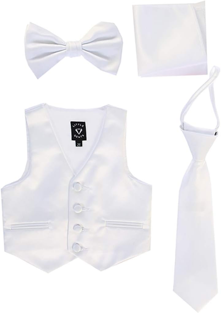 4-Piece includes satin vest, adjustable neck-tie, cilp-on bowtie and matching color pocket square or hanky