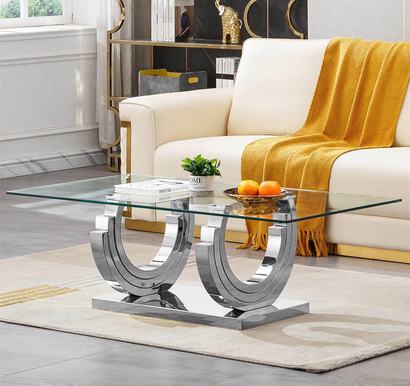 -Coffee Table Specification: Product Dimensions: 47.24x23.62x17.72"H Product Weight (lbs.): 57.95 Color: Clear Glass & Silver/Gold Top Material: Tempered Glass Base Material: Mirrored Stainless Steel Package Size&Weight: 56.6 x 26.7 x 5.51 in. 69.3 lbs. Item Include 1 x Coffee Table
