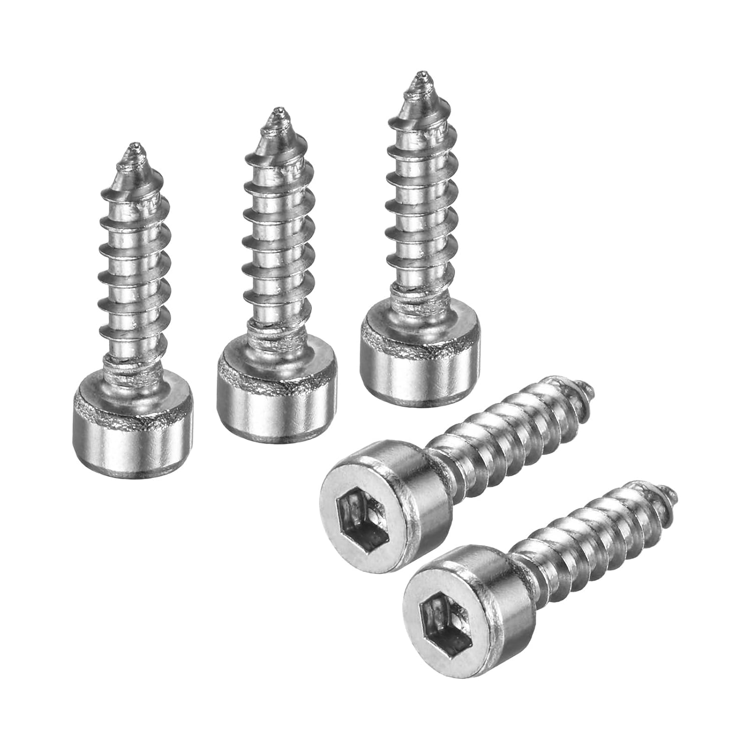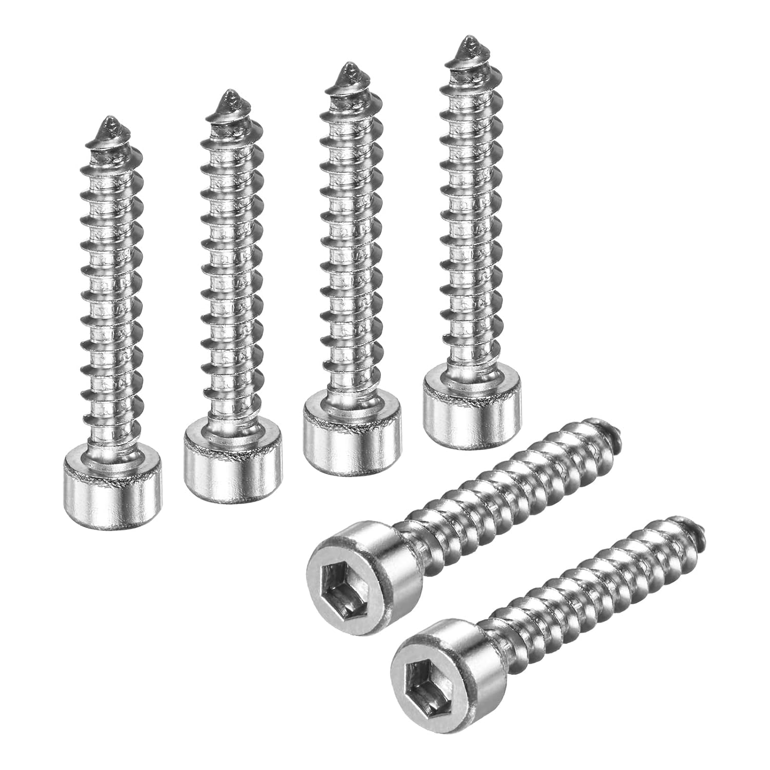 PRODUCT APPLICATIONSelf-drilling screws are suitable for most wood panels and mechanical equipment, such as furniture, tables, stools, automotive repairs, electronic equipment, building accessories, sports equipment, and other DIY projects.PRODUCT DETAILS√ Type: Hex Socket Head Cap Self-Tapping Screw√ Material: Stainless Steel√ Color: Silver√ Thread Size: M6√ Head Size: 0.35 x 0.22 inches/9 x 5.7mm (Dia x Thk)√ Thread Length: 1.57 inches/40mm√ Hexagonal width across flats: 0.2 inches/5mm√ Package Includes: 100 Furniture ScrewPRODUCT ADVANTAGES1. Made from 304 stainless steel, these screws offer high strength and hardness, excellent corrosion and rust resistance, and maintain their strength even in outdoor environments, ensuring a durable, reliable product with a long service life.2. The hex socket head cap screws feature a hexagon socket head design for high torque transmission and anti-slip performance. The self-tapping tip easily penetrates the material, eliminating the need for pre-drilling, ensuring a secure and precise installation.ATTENTIONUse the appropriate hexagonal wrench for installation and avoid over-tightening to prevent damage to the screw or the material.