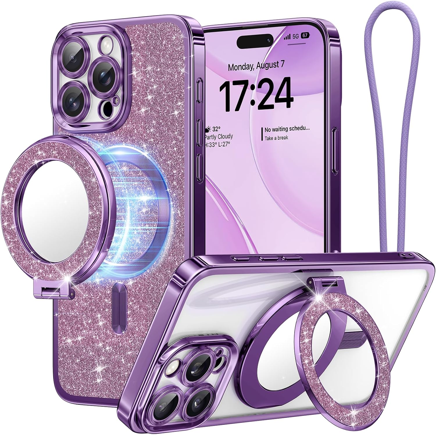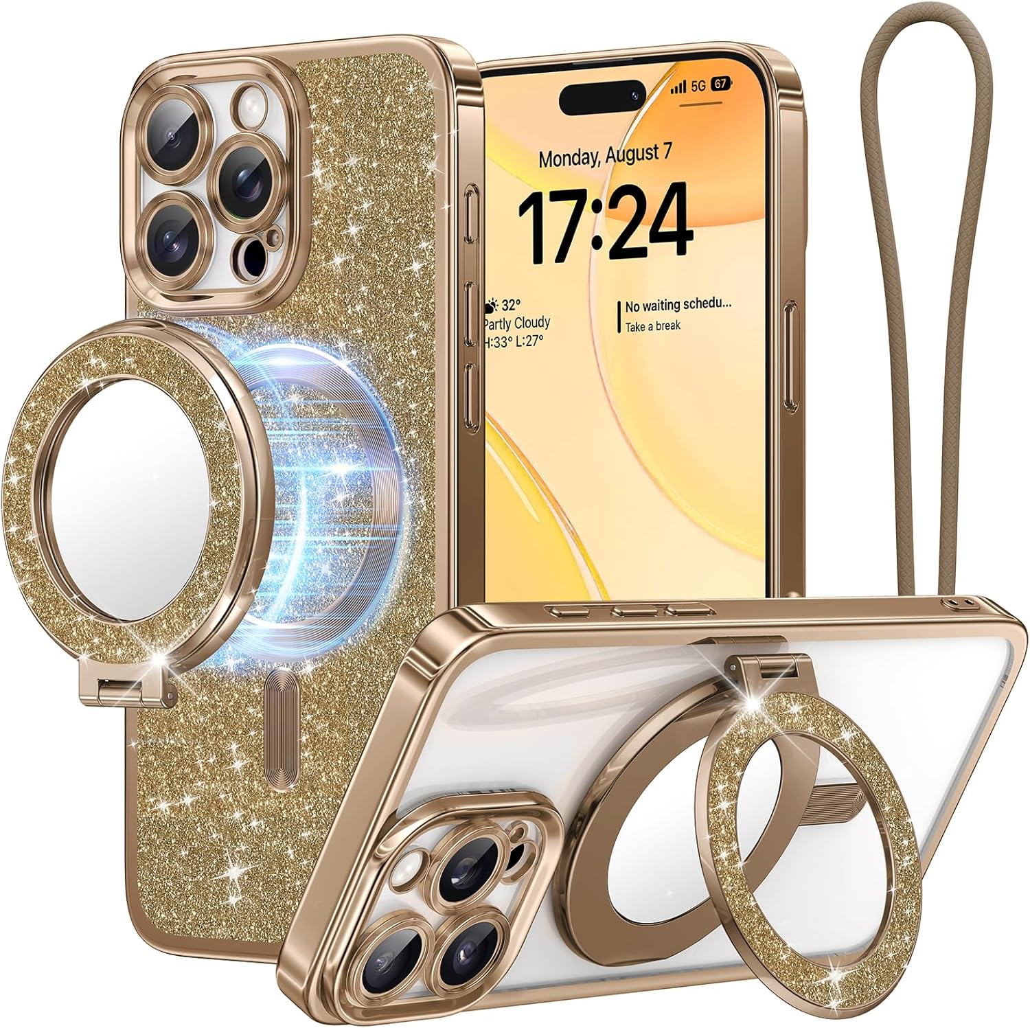 | BuiltIn Media | ①Magnetic Case Designed for iPhone 17 Pro Max ②Magnetic Phone Ring Holder with built-in mirror ③ Glitter Card ④Wrist Strap |