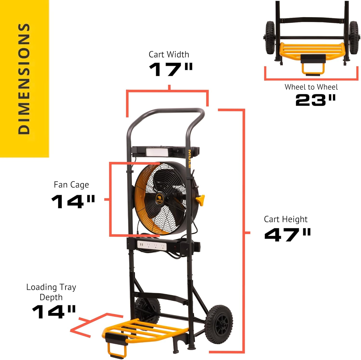 "Designed to make everything you do easier, the MULE 5-in-1 Mobile Workshop is the ultimate project cart for capable DIYers and professionals. With a powerful, 3-speed adjustable fan, bright LED light, power strip with a 10-foot cord, loading tray to haul materials, and tool caddy to store small tools, the Mobile Workshop reduces clutter in your workspace and adds convenience to any job. It combines all the project essentials in one place and lets you haul your tools where you need them. At MULE, we’re dedicated to delivering innovative solutions for everyone, from DIYers to professionals. Our products are made to meet the highest standards of performance and durability "