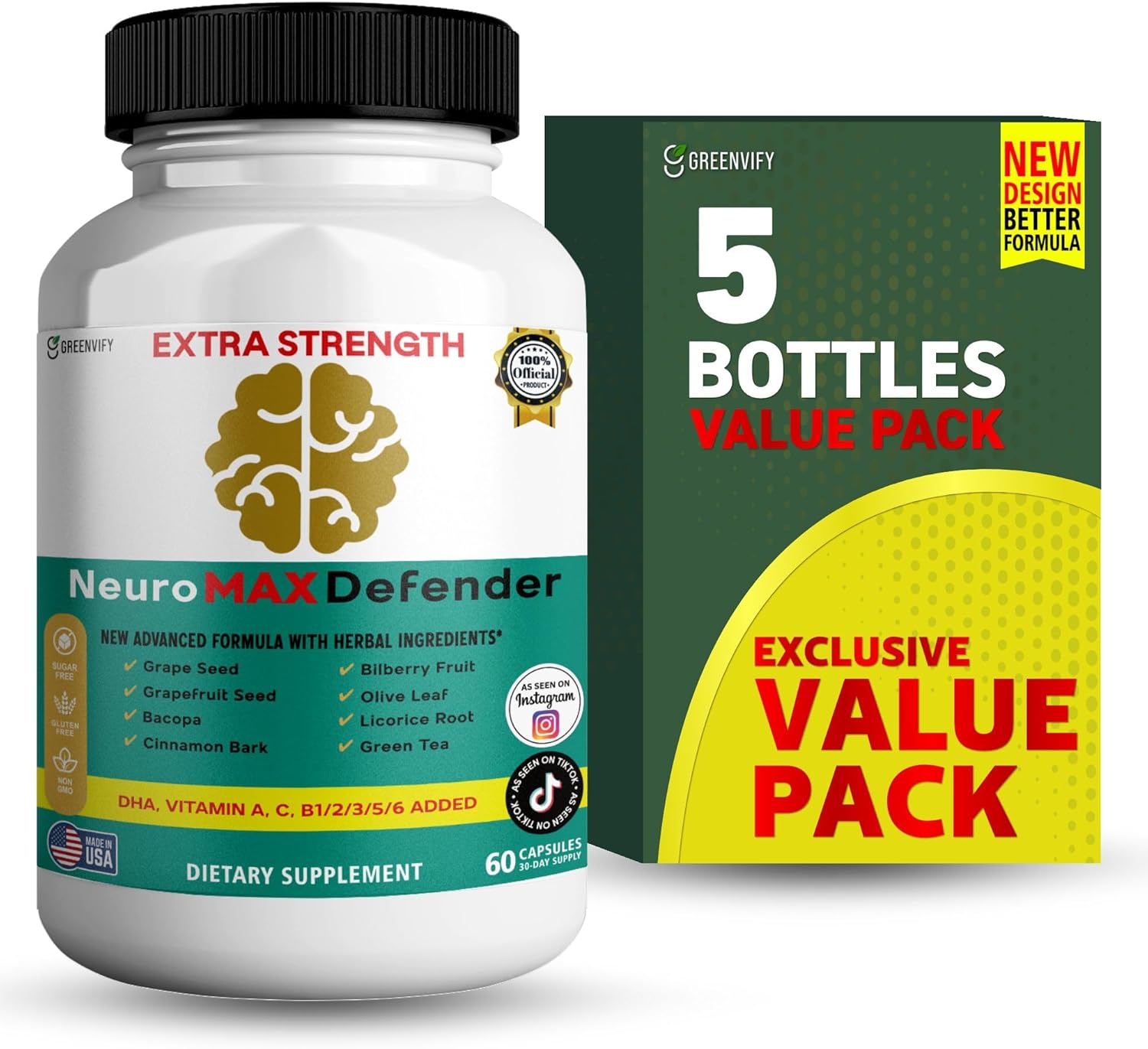 NeuroMAX Defender Extra Strength Brain Support Supplement with Herbal Blend, 60 Capsules, DHA, B12, Vitamins A C D E, Selenium, 30-Day Supply