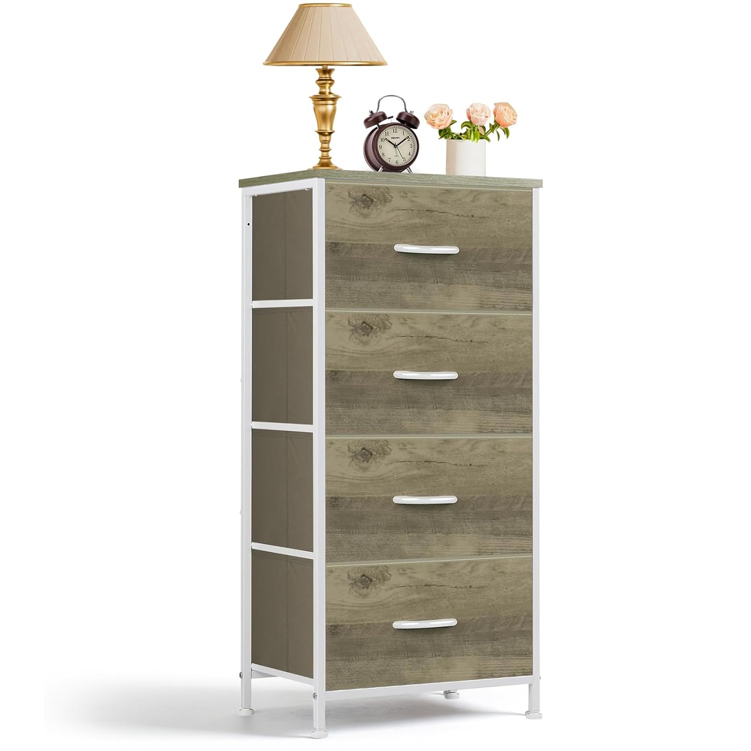 The nightstand features 5 spacious fabric drawers that provide plenty of room for jeans, T-shirts, pajamas, socks, underwear, accessories, and more. Built with a sturdy steel frame, scratch-resistant MDF wooden top, and breathable non-woven fabric bins, this tall chest of drawers is both lightweight and durable. The wood top doubles as a shelf for lamps, décor, or personal items, while the slim vertical design makes it an excellent choice for small apartments and tight spaces.