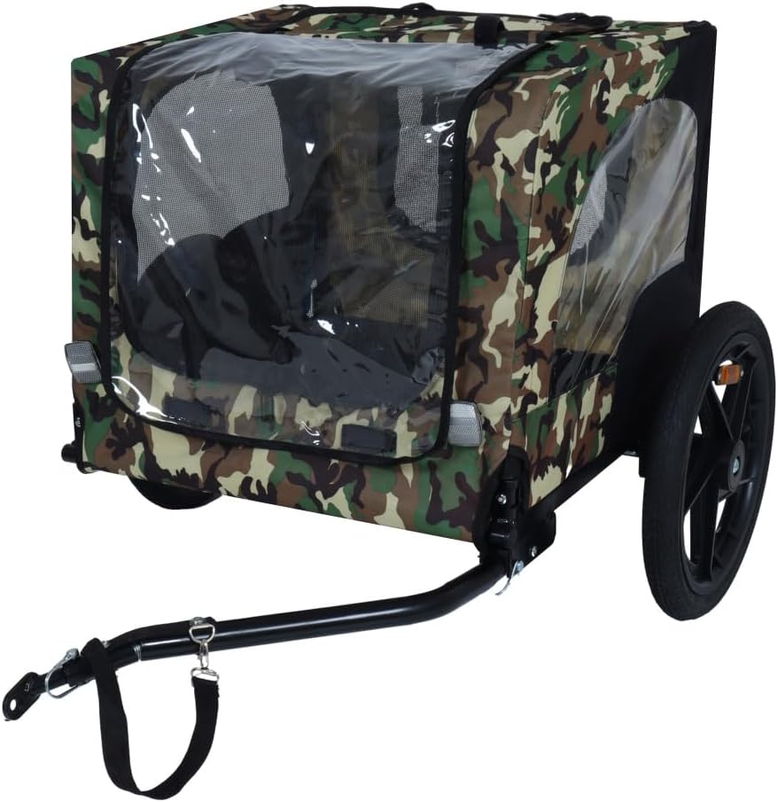Built with powder-coated steel frame and waterproof oxford fabric, this dog bike trailer is durable and stable for long lasting use. With a weight limit of up to 66 lbs, you can bring medium size dogs, such as beagle, spring spaniel, border collie, bull terrier.The unique folding frame makes the pet trailer easy to store and bring along on your next adventure! The low maintenance, 16 inch, 1-piece molded nylon wheels have air-filled tires that easily inflate with standard bike pump. Do not over-inflate.Weather-resistant fabric with a 2-in-1 canopy and mesh shield allows your dog to enjoy the ride in the bike trailer. Mesh windows and a spacious roof opening in the pet cage ensure proper ventilation, letting your pet enjoy the breeze and the view.The dog bike trailer is equipped with an inner leash and a non-slip floor to keep your pet safe and secure. The adjustable leash prevents pets from jumping out of the trailer. A safety flag and reflective lights on the front and back ensure excellent visibility, making your rides completely safe.The reflector provides extra protection when it is dark.The foldable dog bike trailer offers the perfect opportunity to enjoy cycling with your pet. Whether it's a relaxing trip in nature or a quick shopping run, this bike trailer for dogs folds up quickly and fits easily into the trunk, making it efficient for every need.