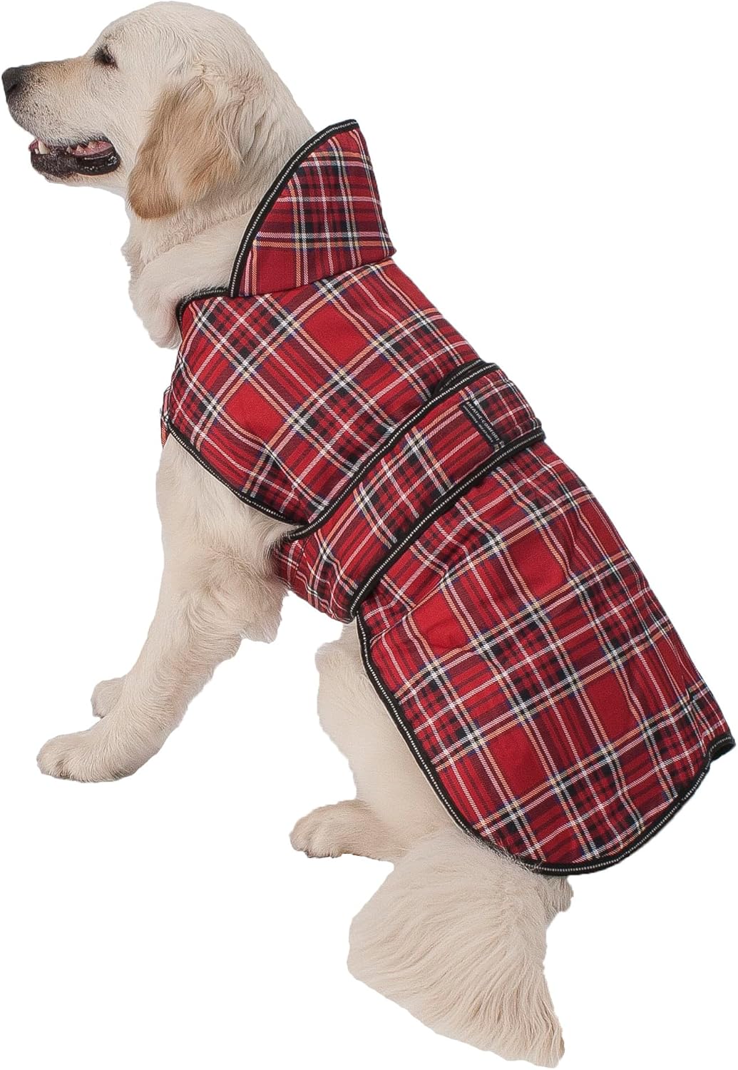 The Kodiak Coat in red plaid is a heavyweight winter dog coat, for harsh weather conditions. Its ultra-durable, windproof, and waterproof design offers full chest coverage, protecting dogs from rain, snow, wind, and extreme cold. The dog jacket features reflective stitching along the seams, collar, and belly strap for enhanced visibility during low-light walks. Its triple-layer construction combines a breathable high-denier nylon shell with a poly/cotton liner, ensuring warmth without overheating. Convenient hook-and-loop strapping and a leash opening make it easy to use, while being machine washable for easy care. Includes ID label and rear optional elastic leg straps.